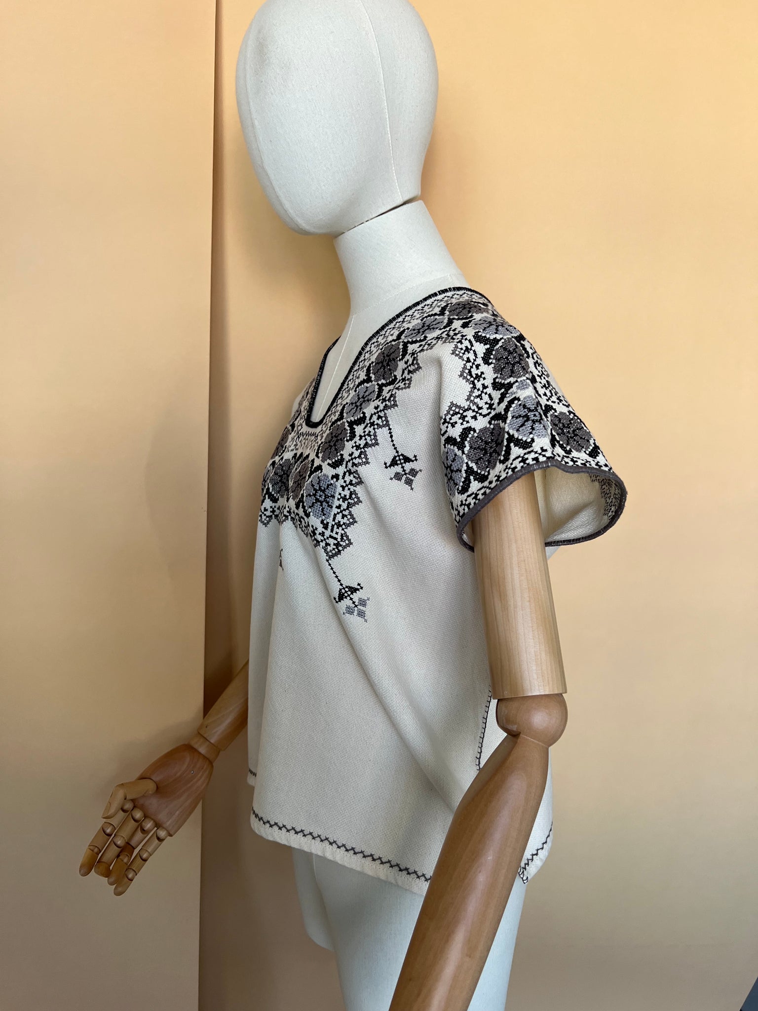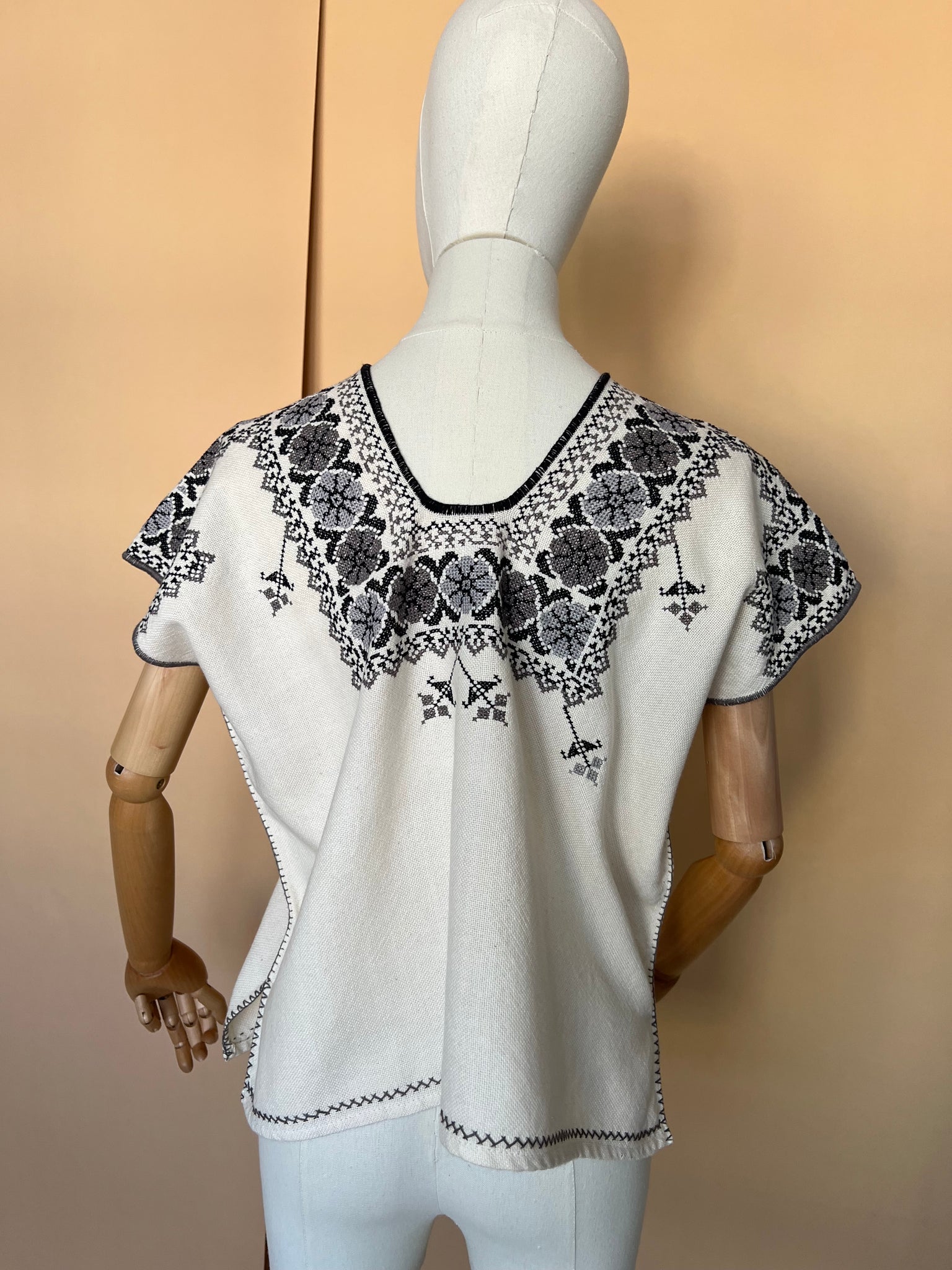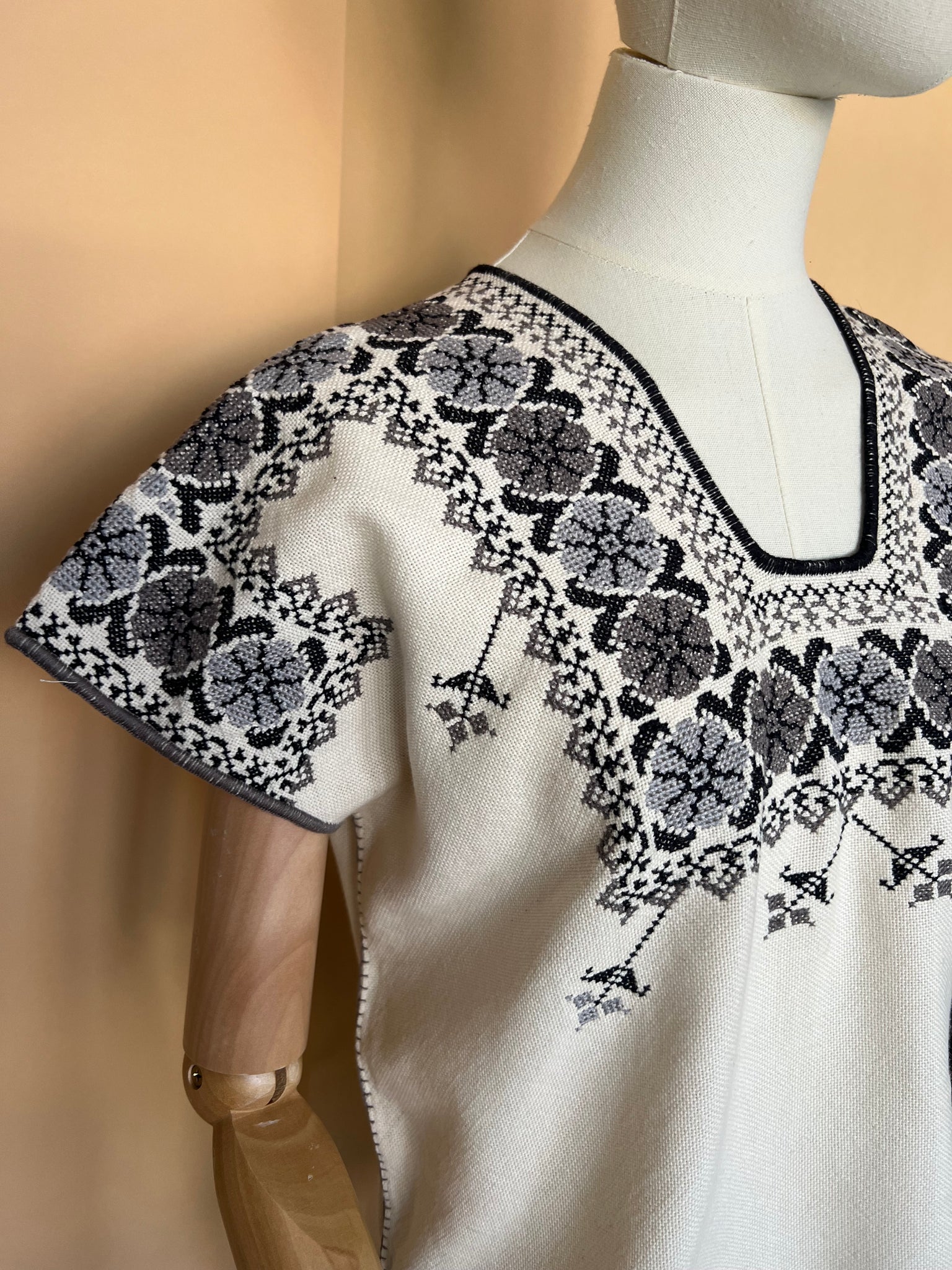 Blusa purépecha en telar de pedal con bordado en punto de cruz por artesanas de la sierra michoacana.
