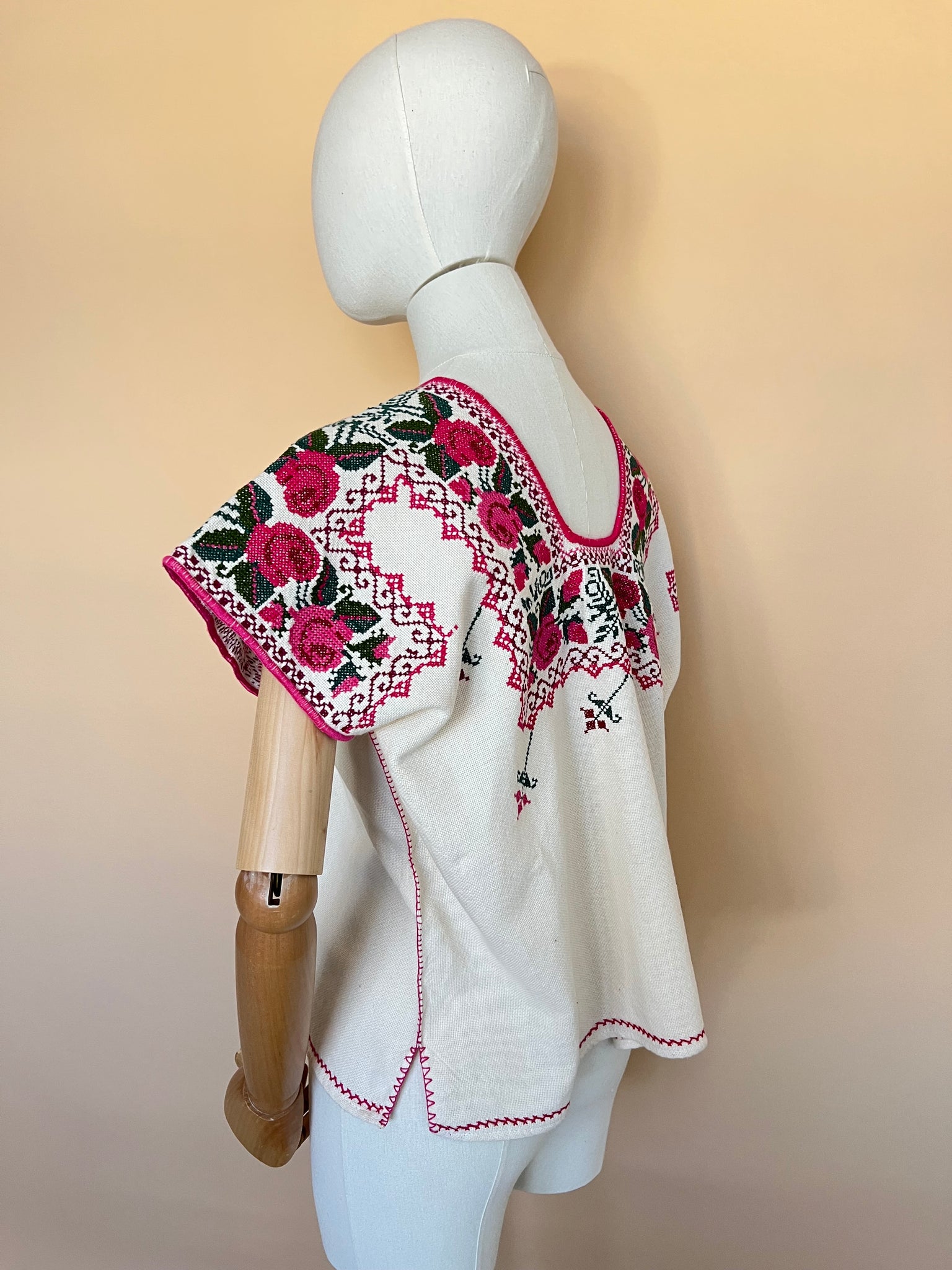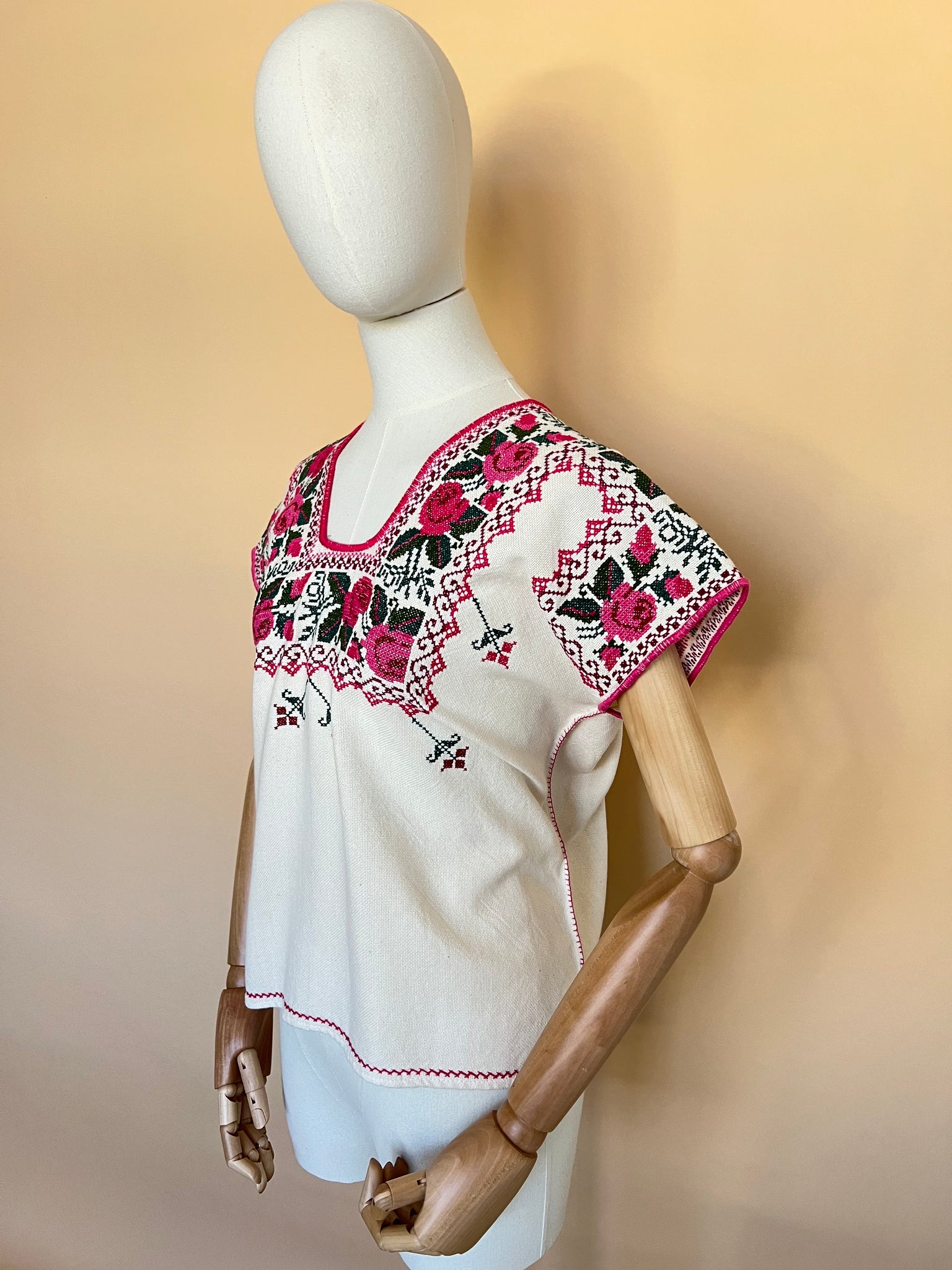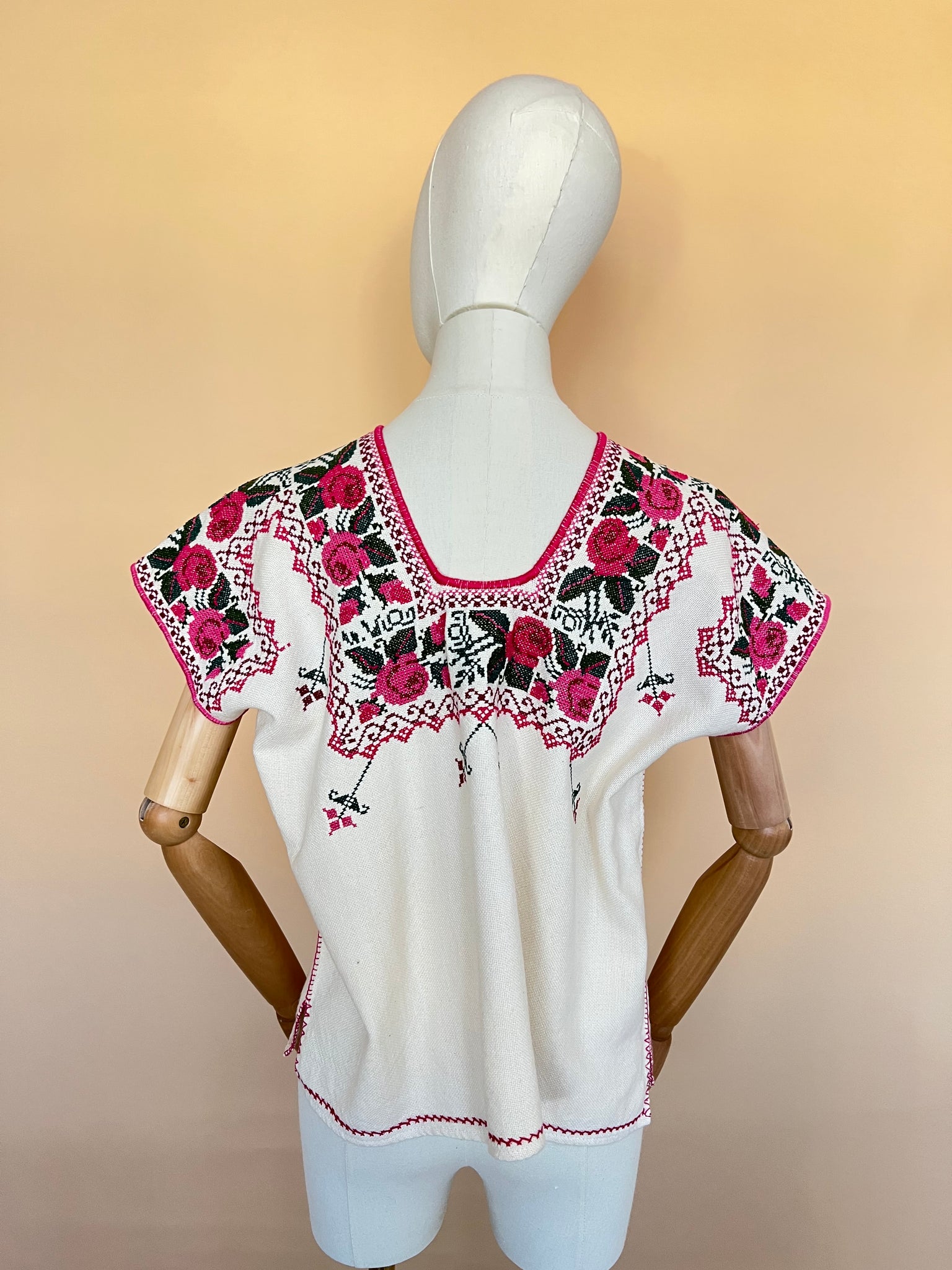 Blusa purépecha en telar de pedal con bordado en punto de cruz por artesanas michoacanas.