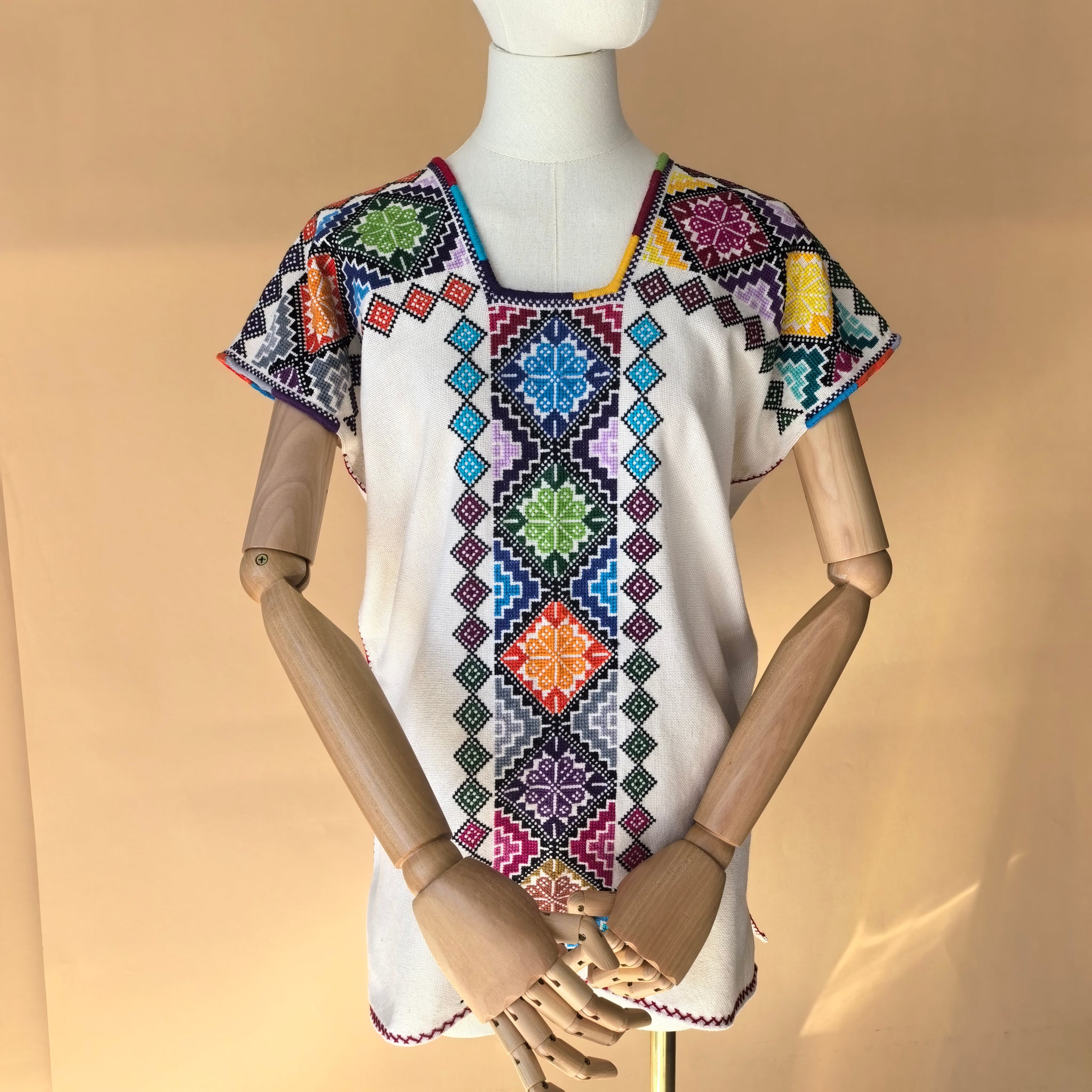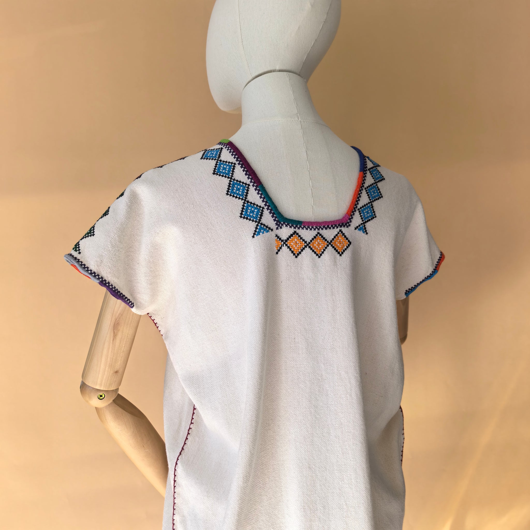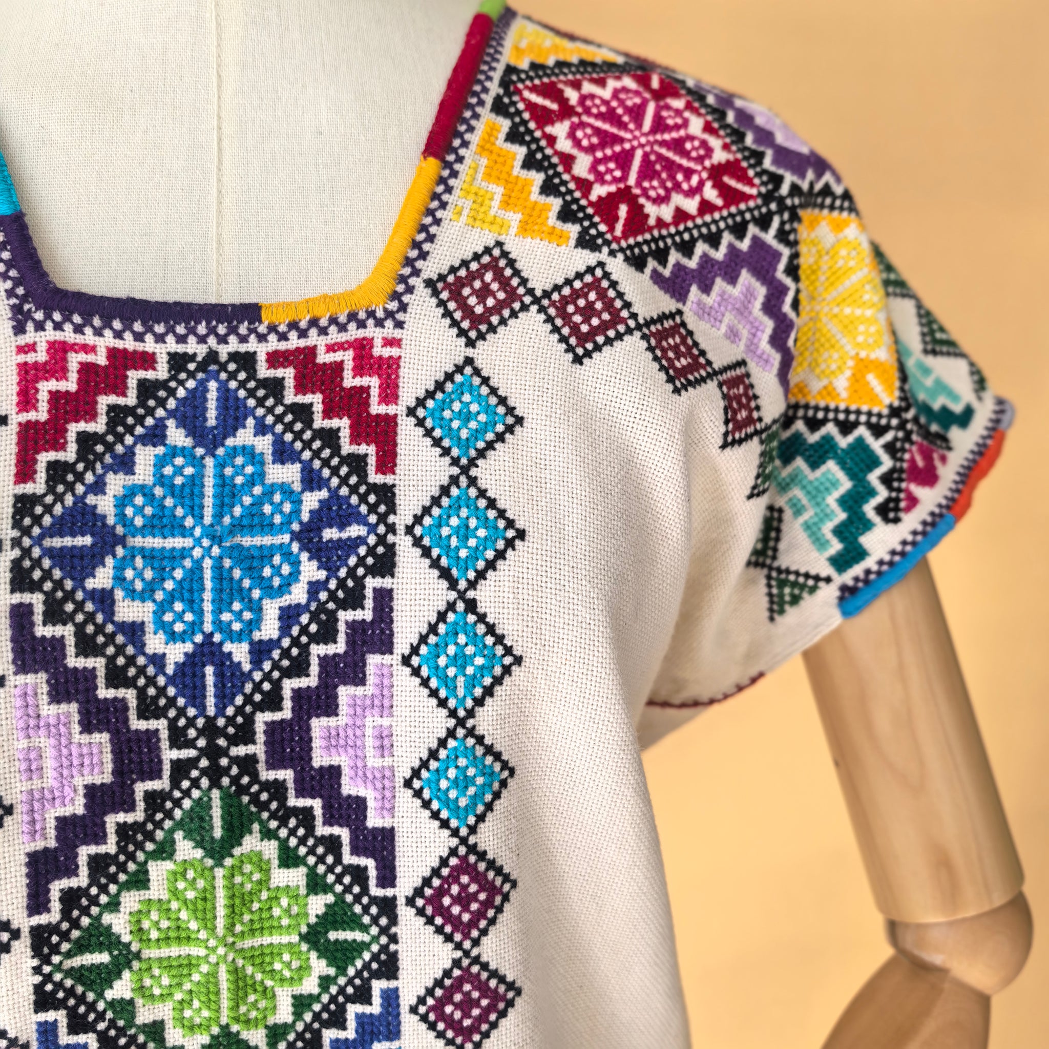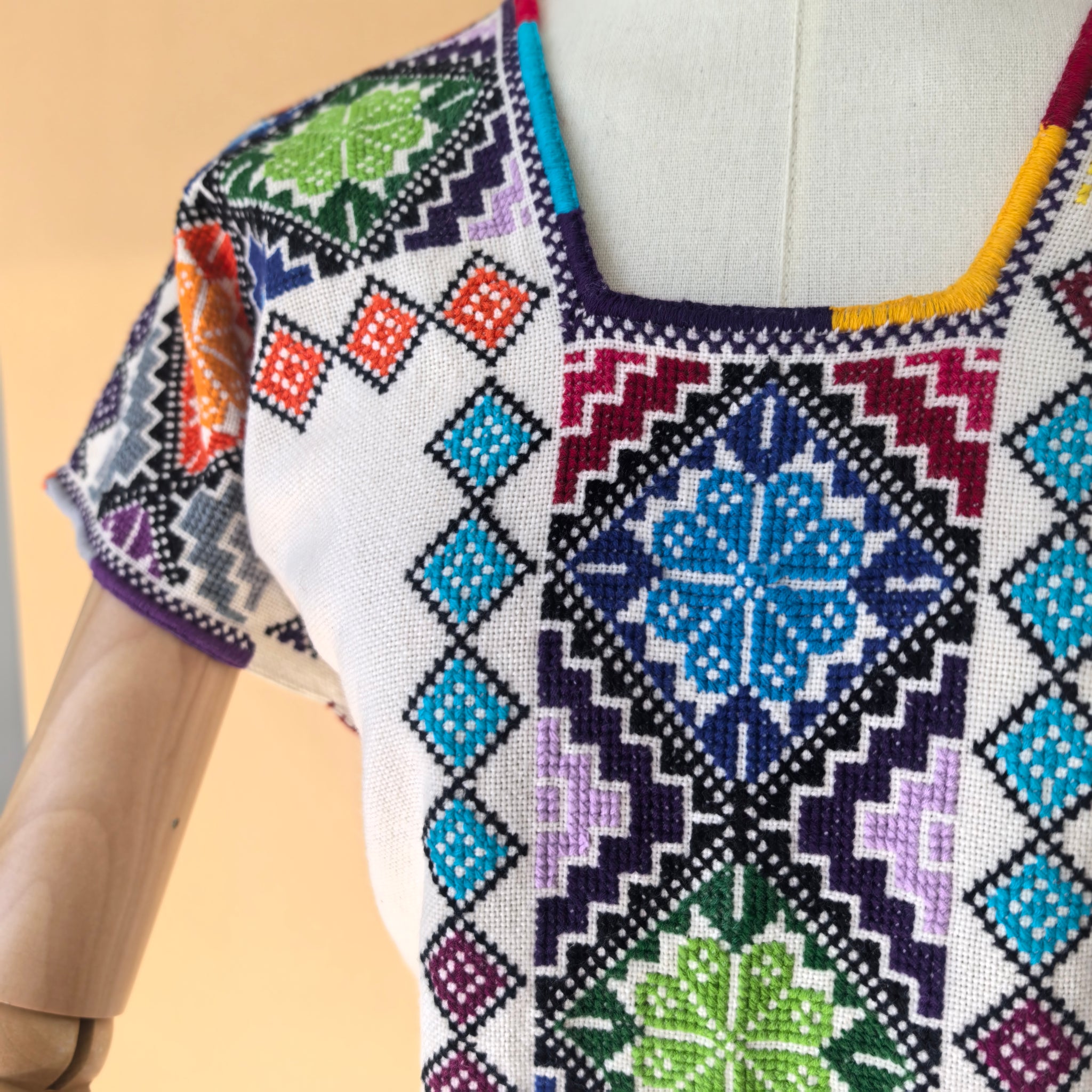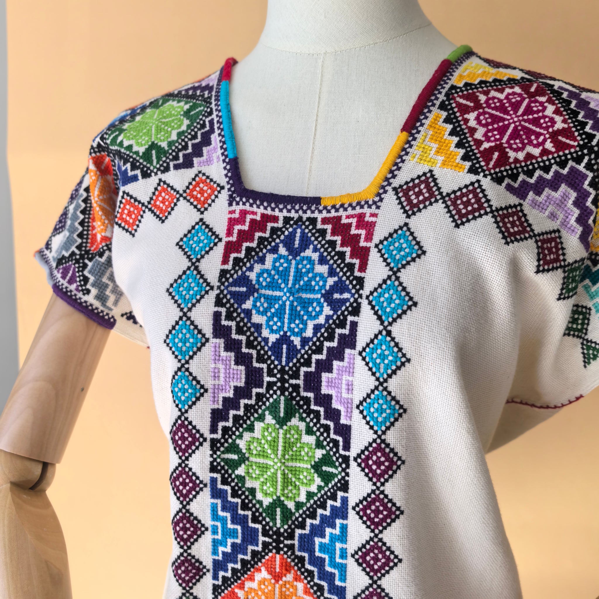 Blusa purépecha en telar de pedal con bordado en punto de cruz por artesanas de la sierra michoacana.