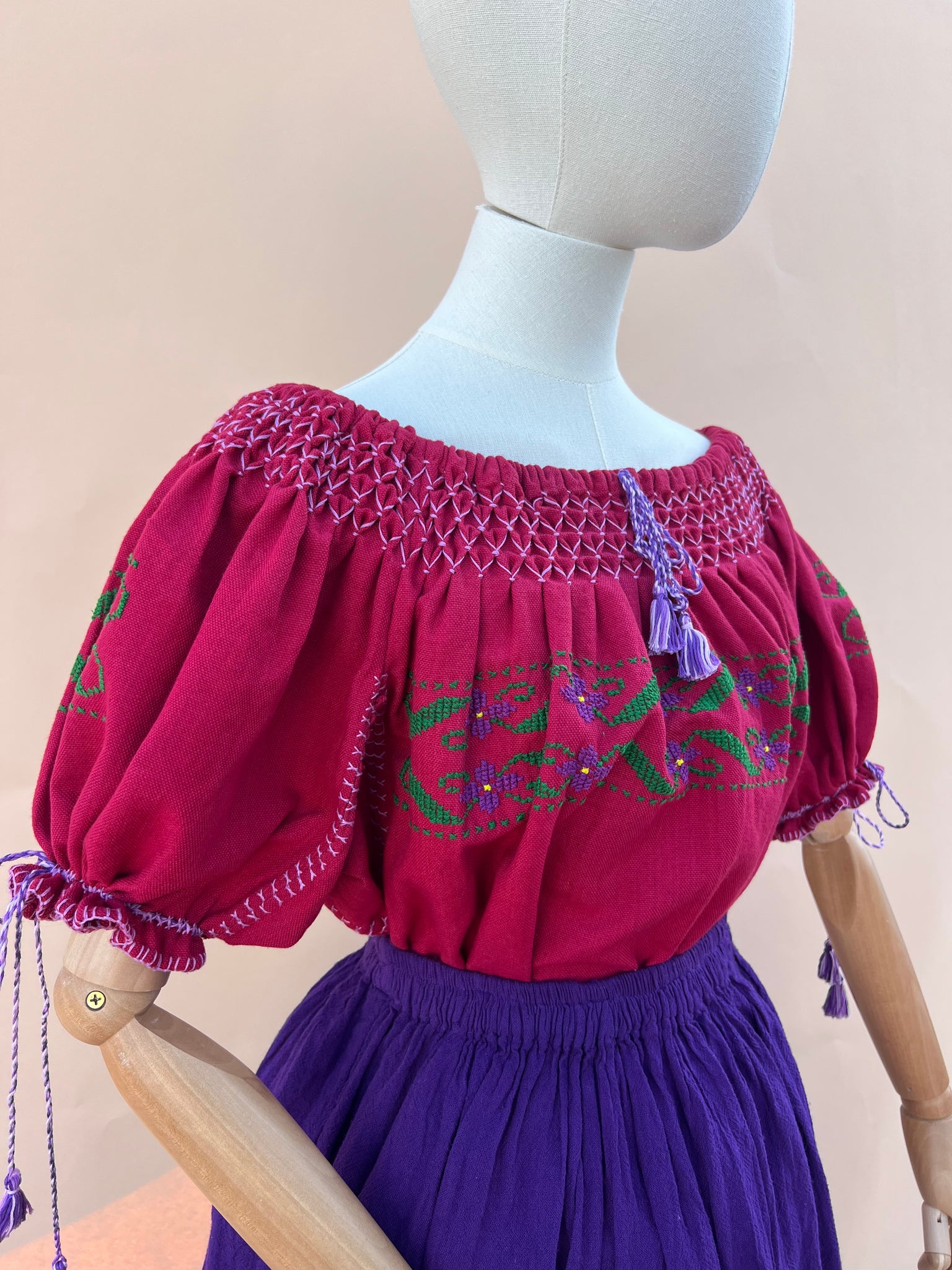 El bordado en punto de cruz y el delicado armado manual convierten esta prenda en una expresión viva del arte textil de Tlazazalca, Michoacán.