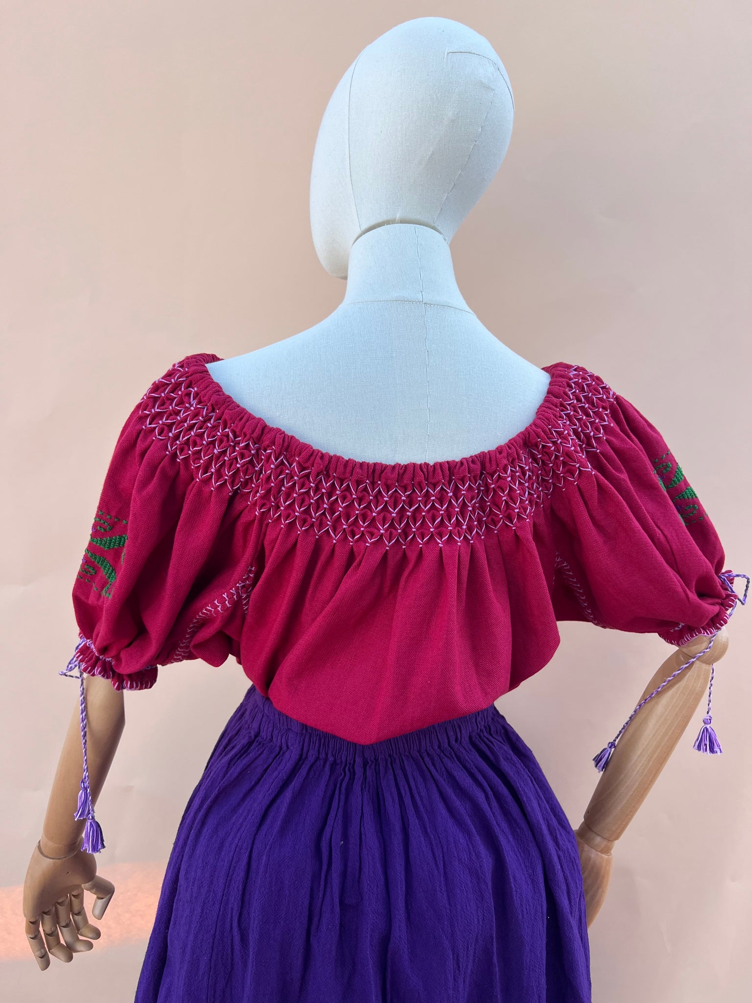 La Blusa PANALITO es una pieza que honra la técnica artesanal del panalito, una forma de plisado que requiere precisión, paciencia y manos expertas.