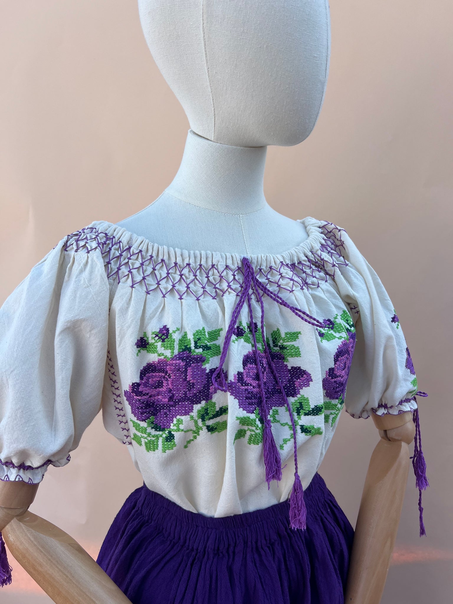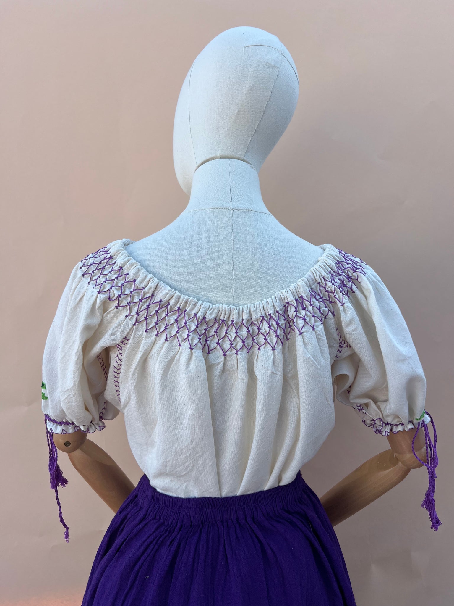 Su base en tono crudo — el color natural del algodón — permite que el violeta del bordado florezca con elegancia y equilibrio.