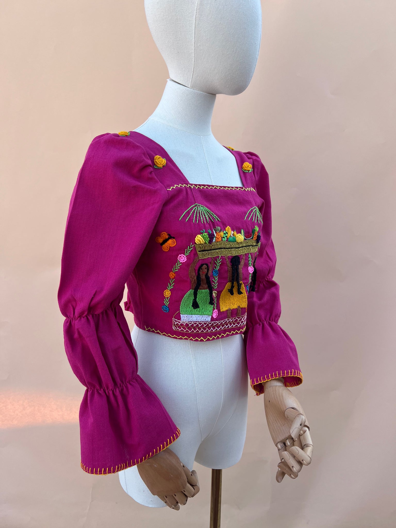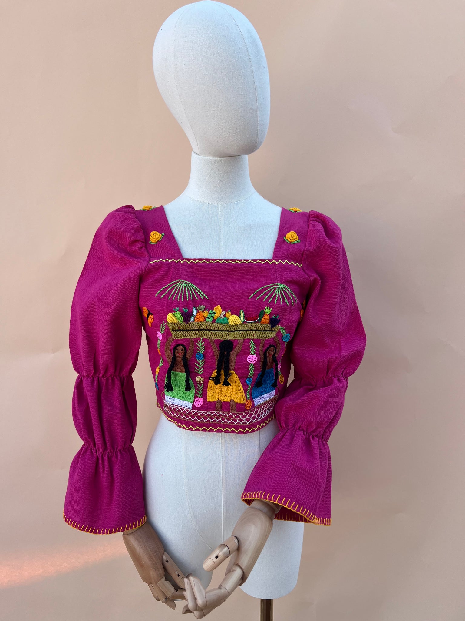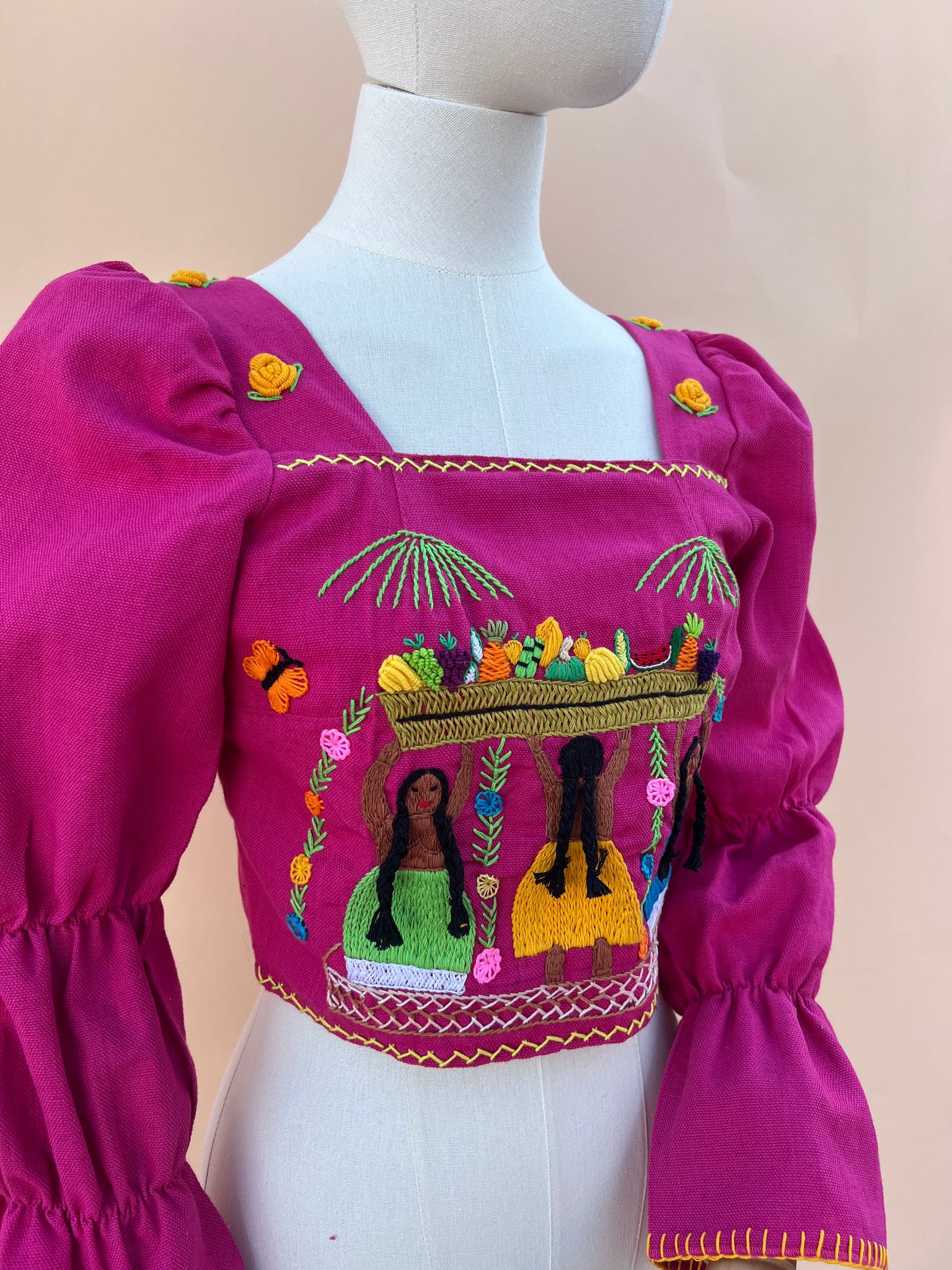 Inspirado en la icónica Fuente de las Tarascas, este top reinterpreta la fuerza colectiva femenina desde el bordado purépecha.