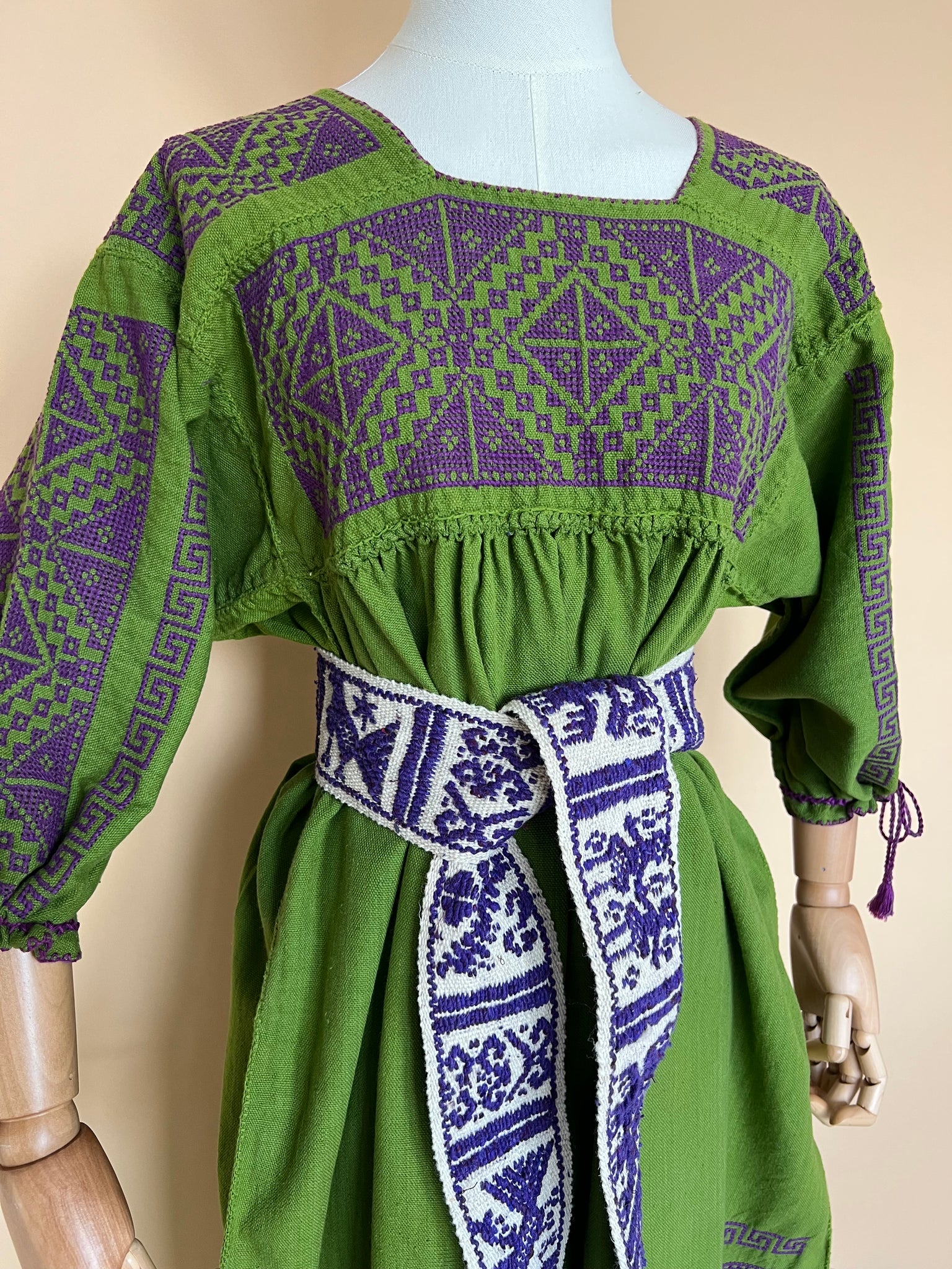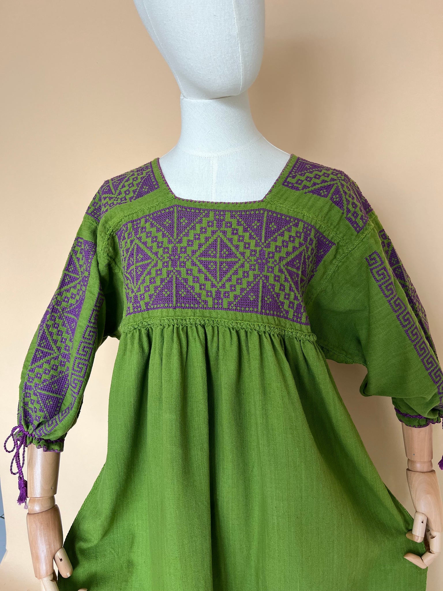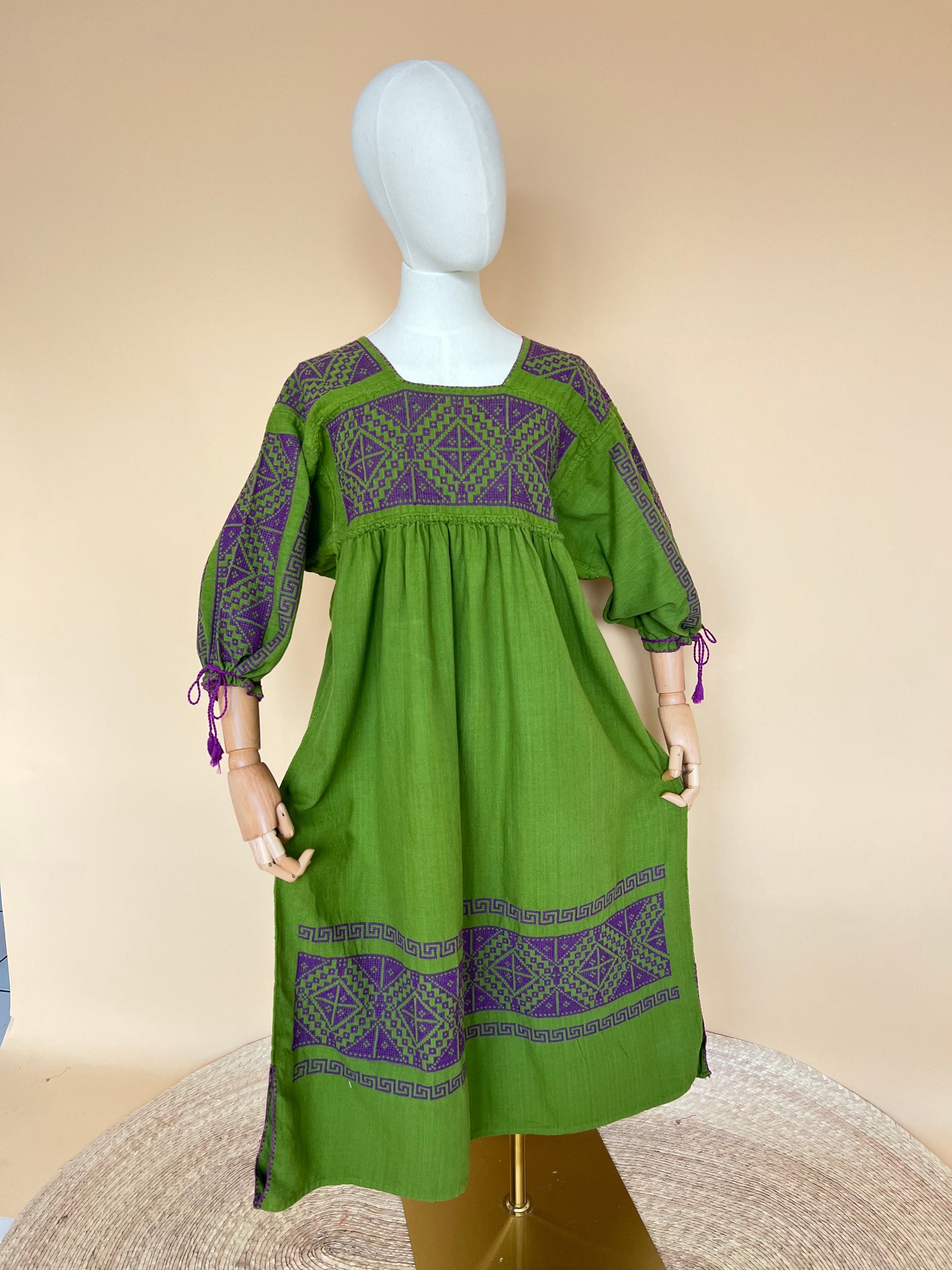 Vestido michoacano en manta artesanal, bordado y confeccionado a mano por artesanas de la región lacustre.