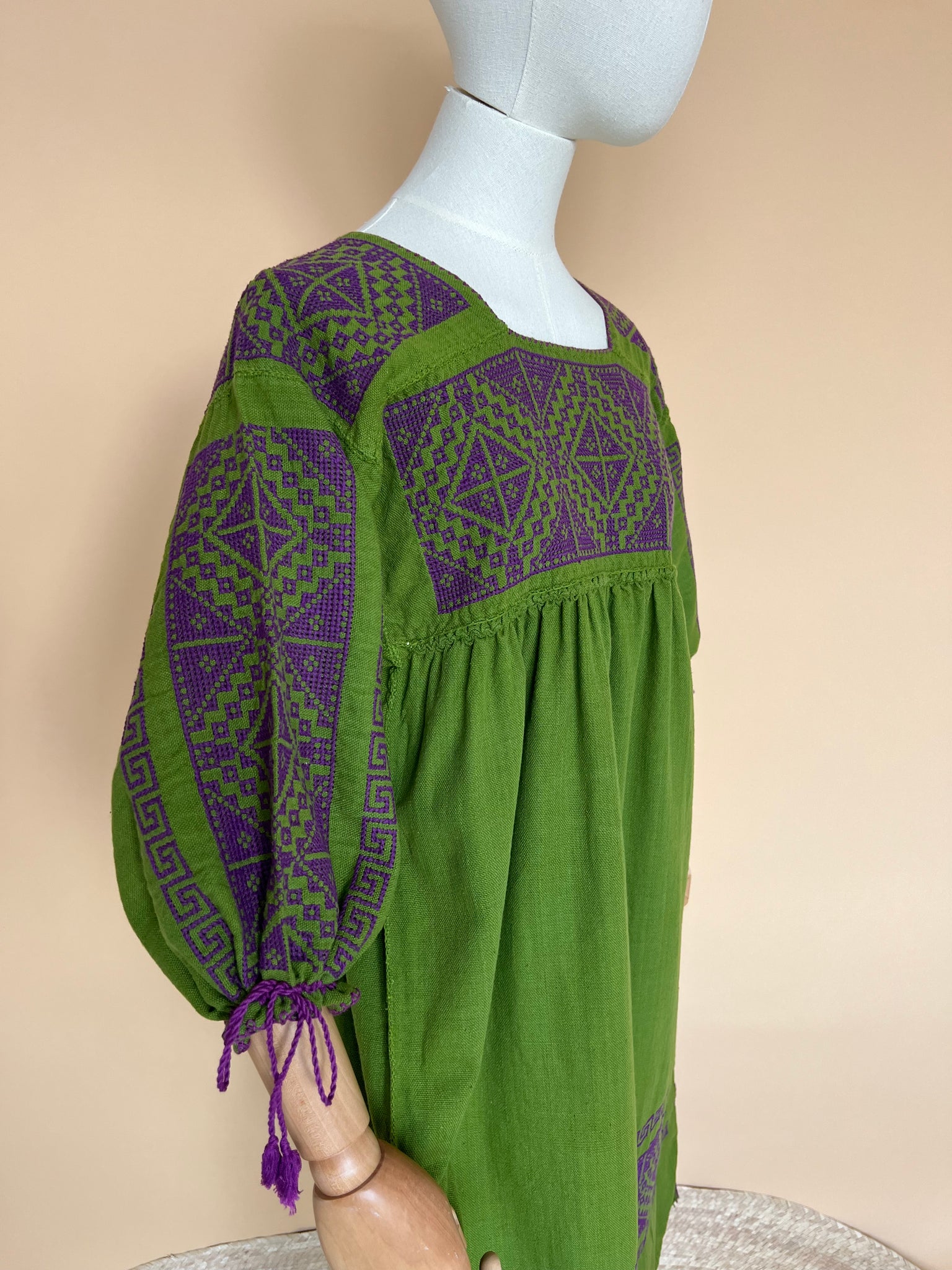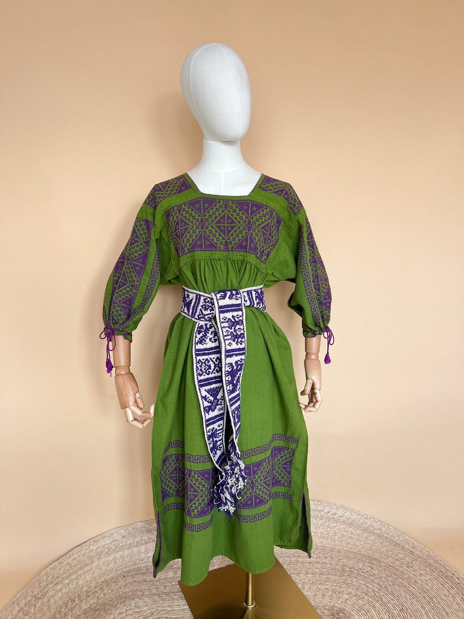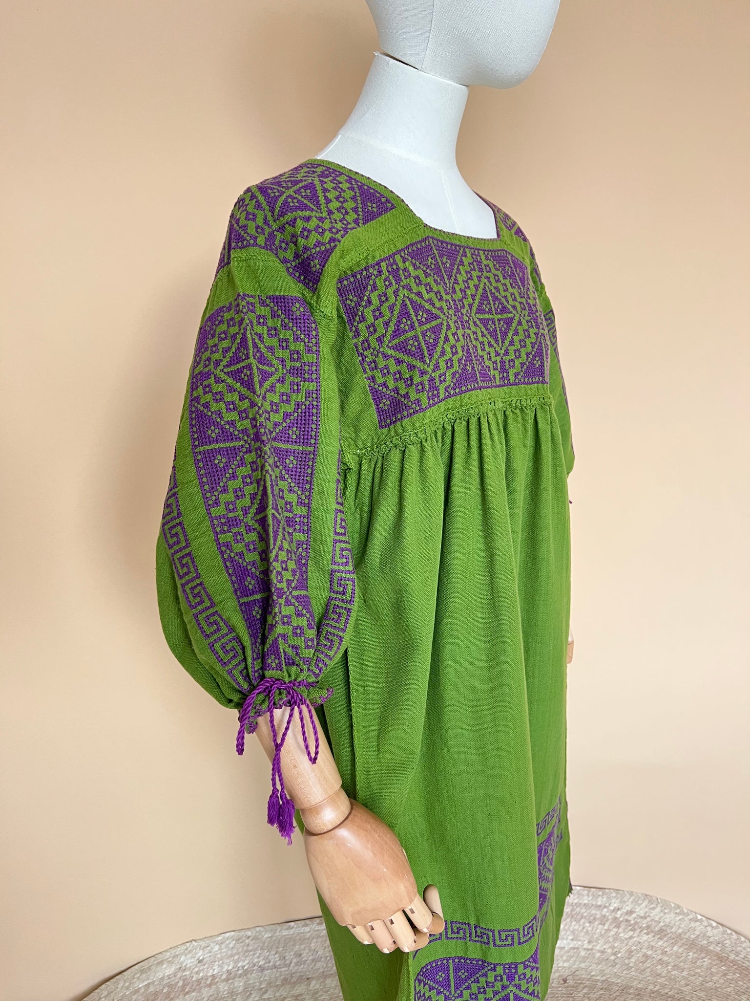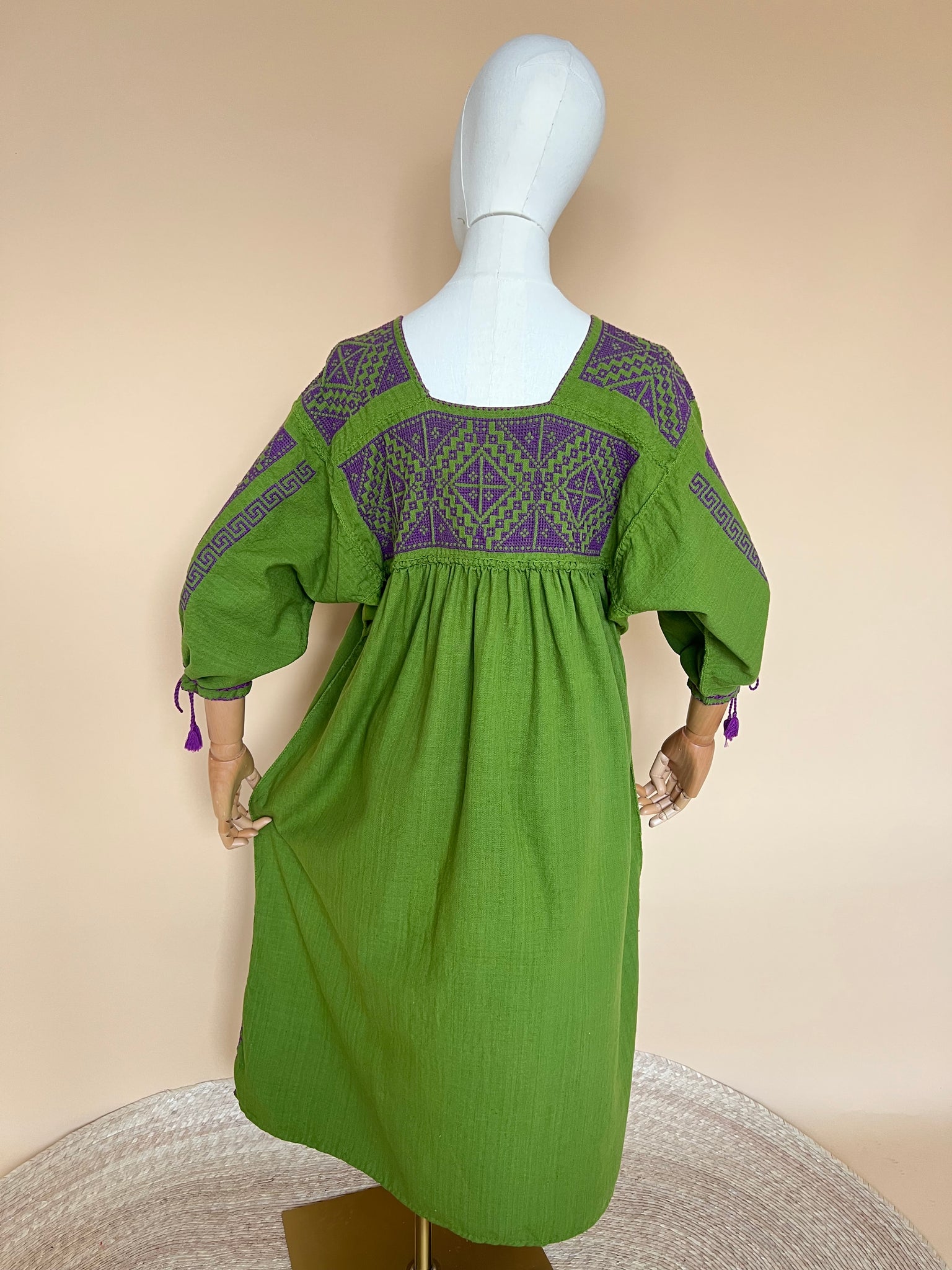 Vestido michoacano en manta artesanal, bordado y confeccionado a mano por artesanas de la región lacustre.