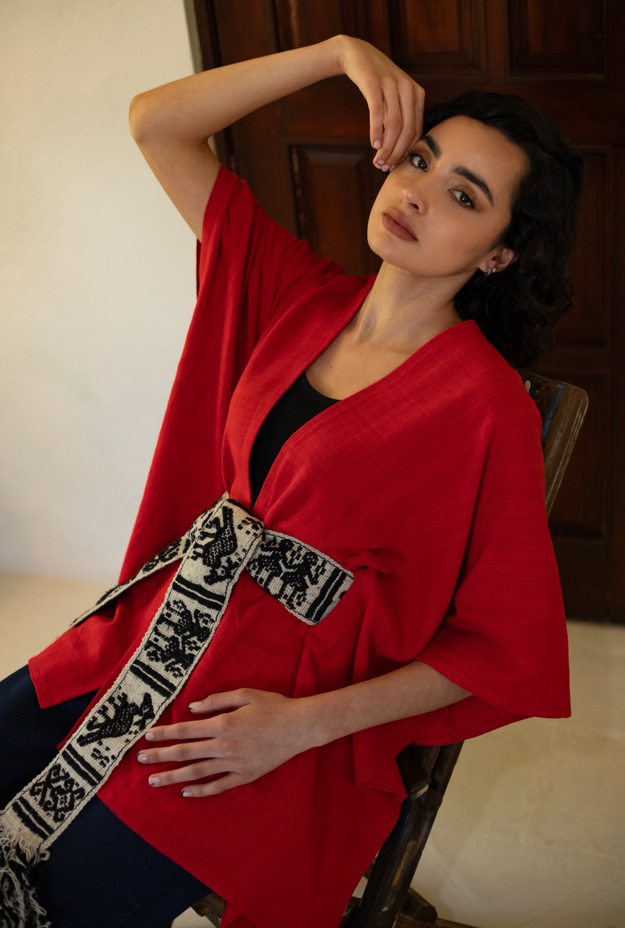 Capa en telar de pedal de 100% algodón con fajo en telar de cintura de lana.