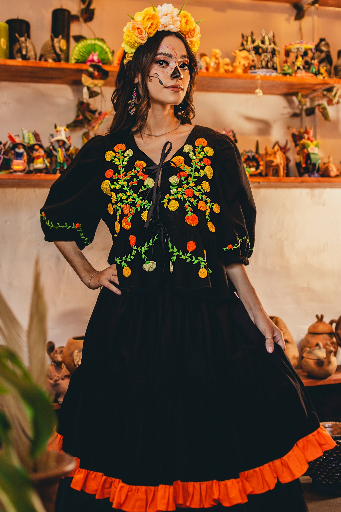 Top michoacano en manta artesanal con bordado a mano representando las flores de Noche de Muertos.