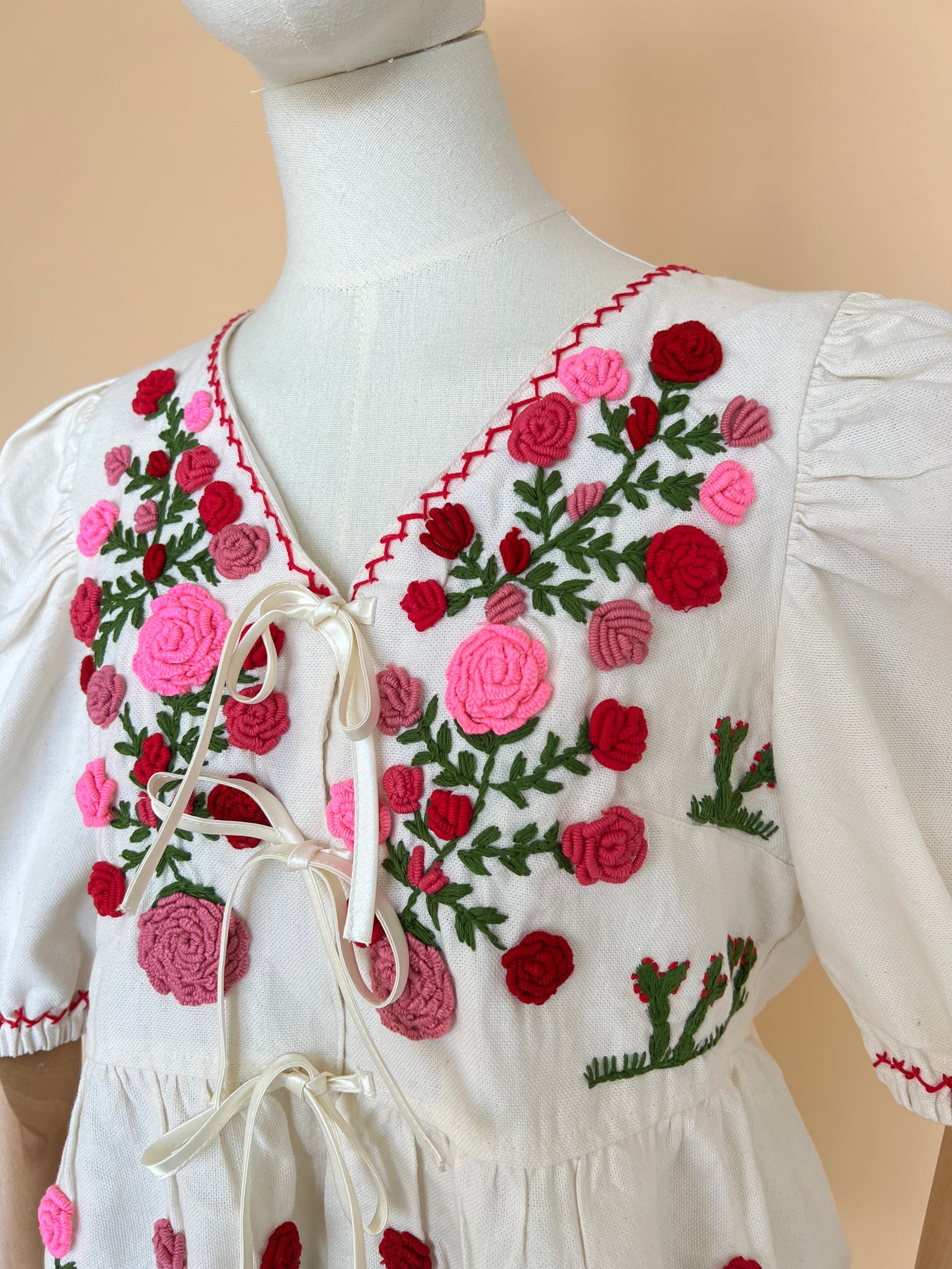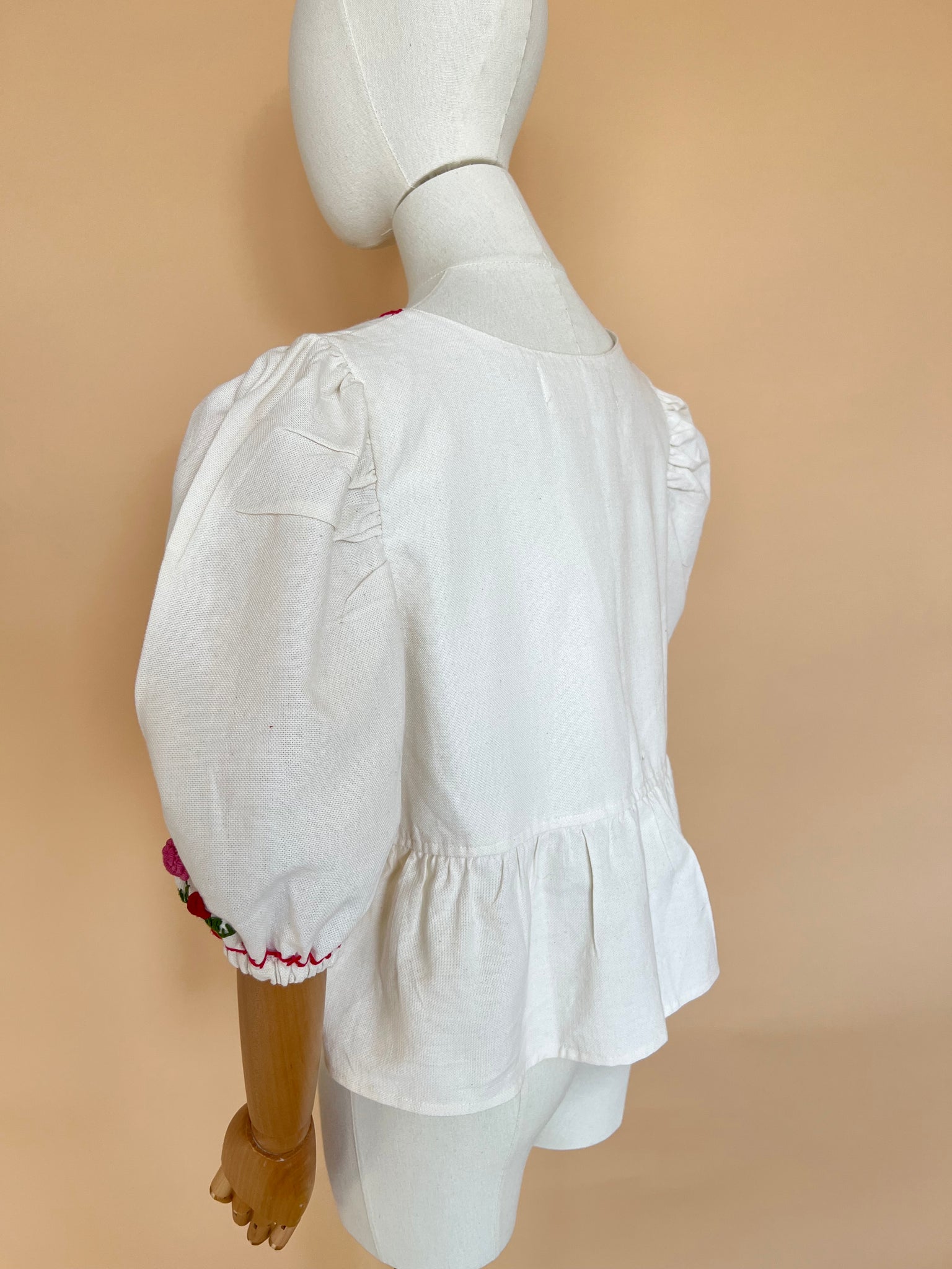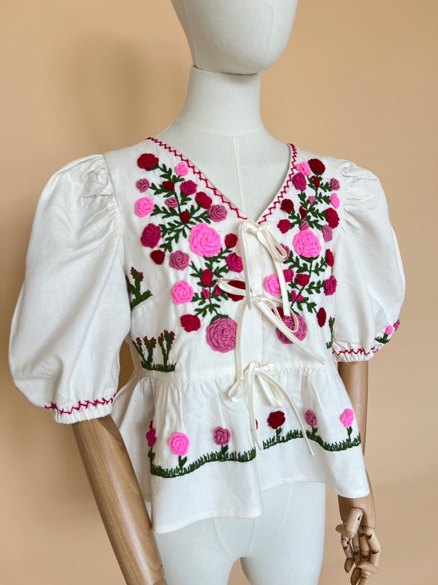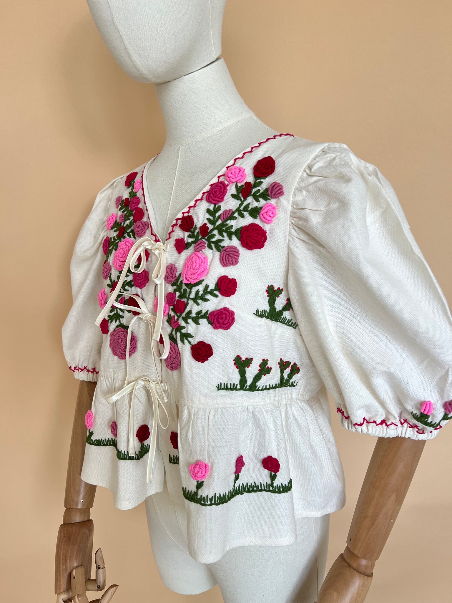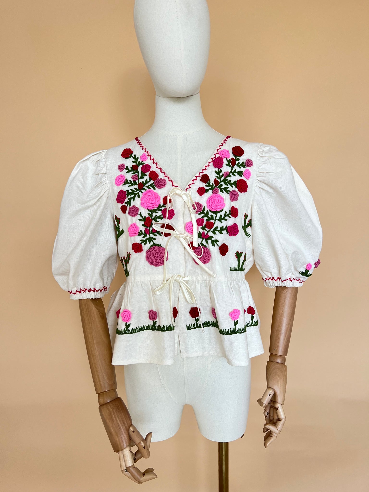 Top michoacano en manta artesanal con bordado a mano representando las flores de Noche de Muertos.