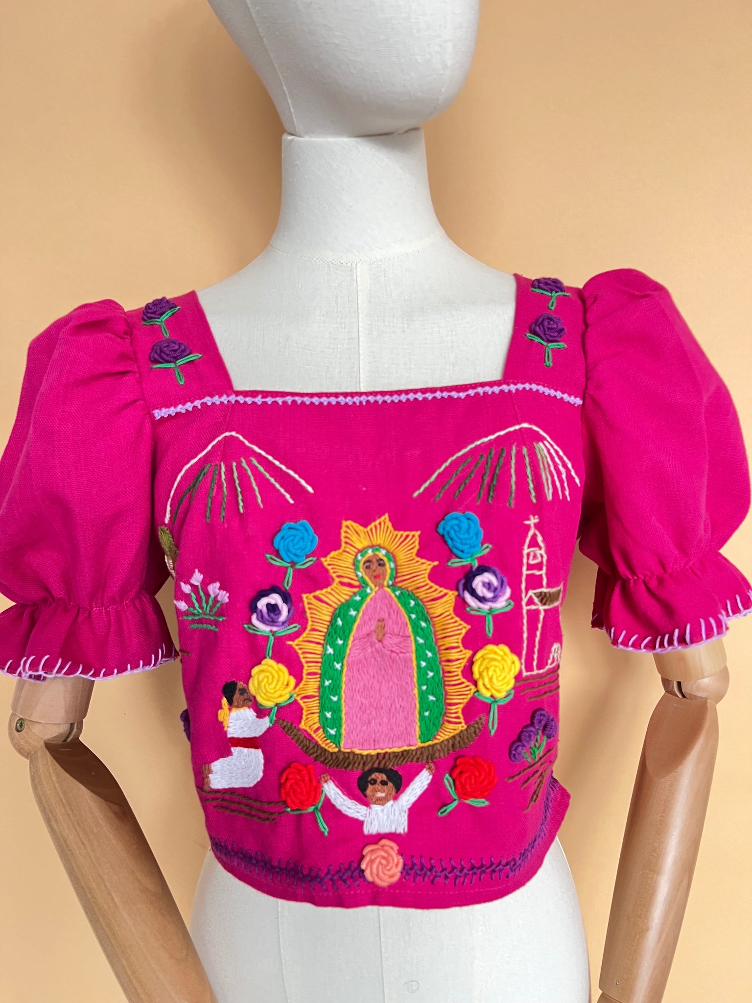 Blusa michoacana en manta artesanal con bordado a mano que honra a nuestra Virgencita de Guadalupe.