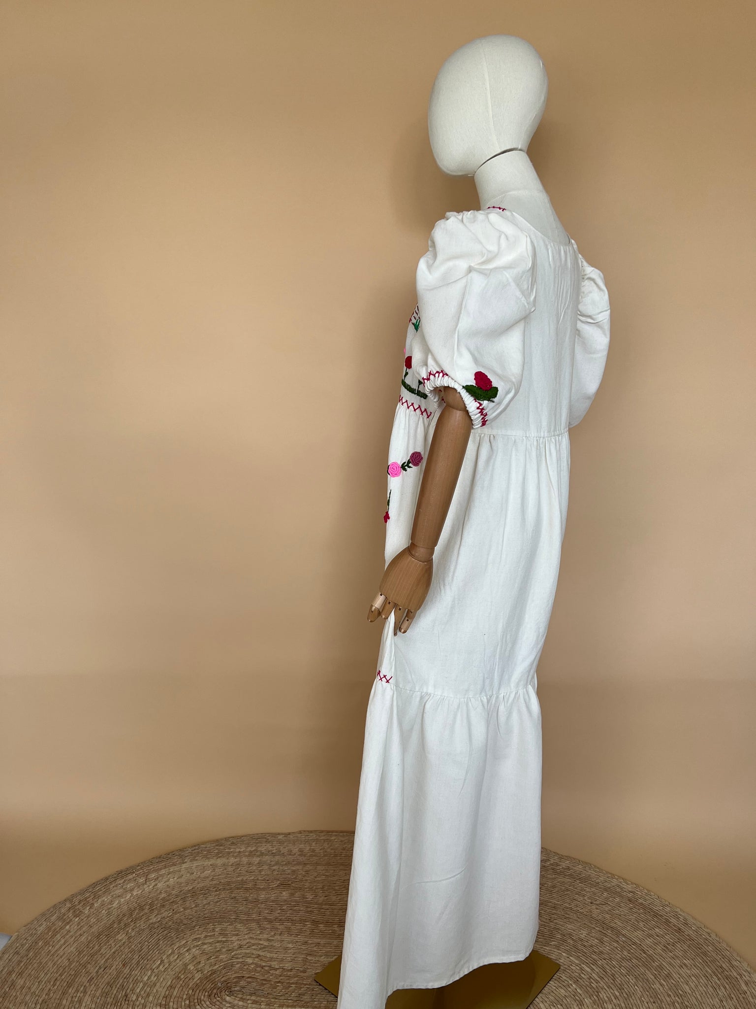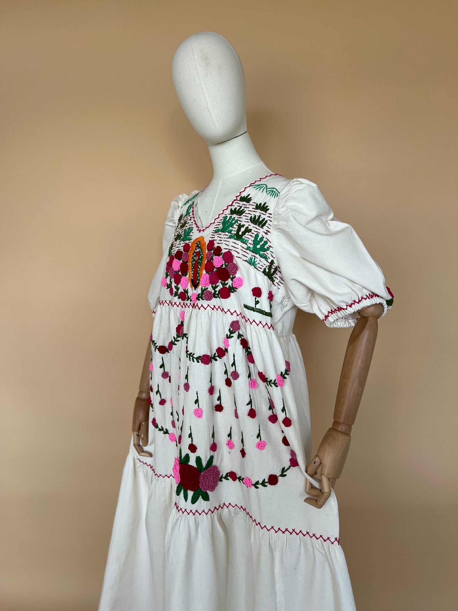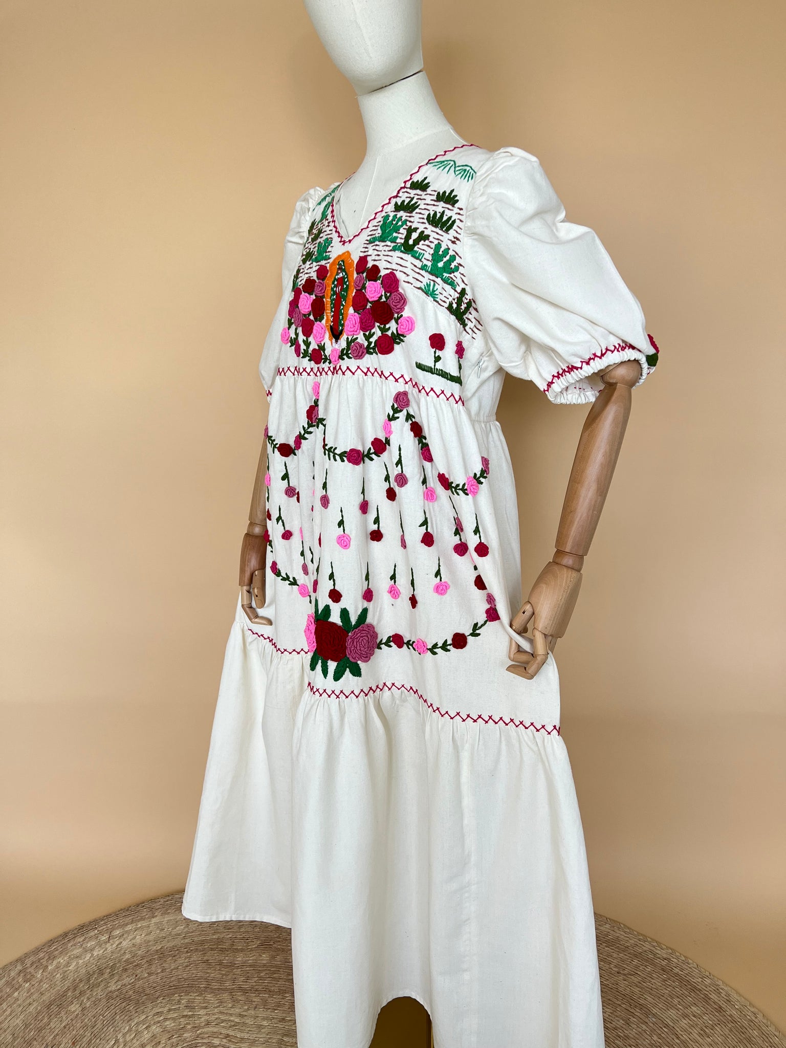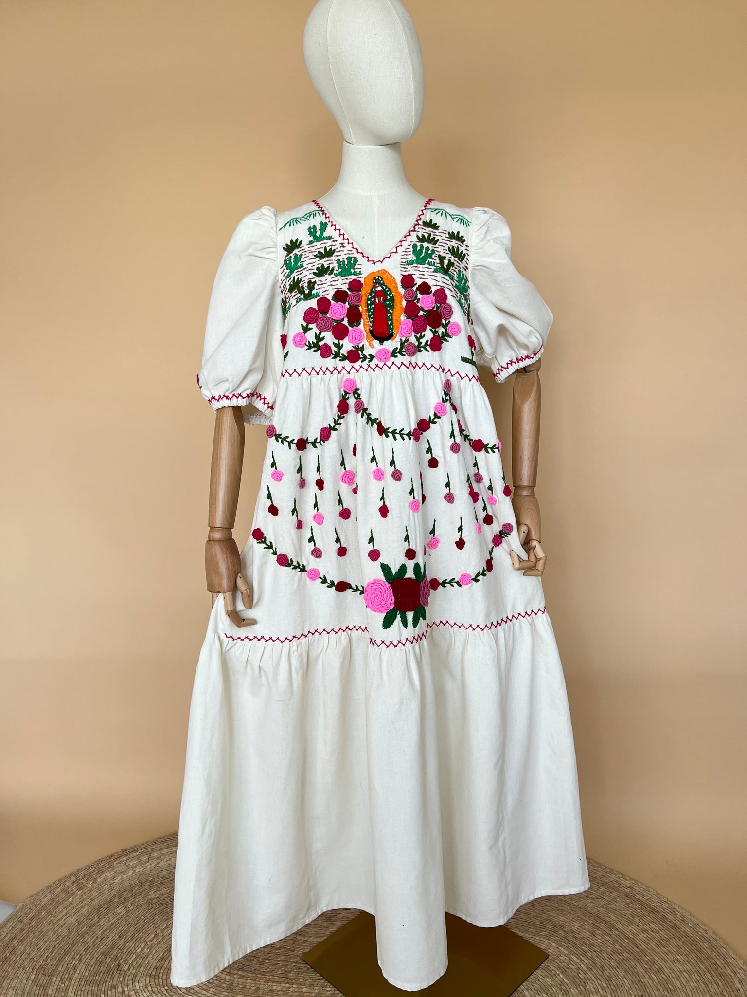 Vestido michoacano en manta artesanal con bordado a mano representando las flores de Noche de Muertos.