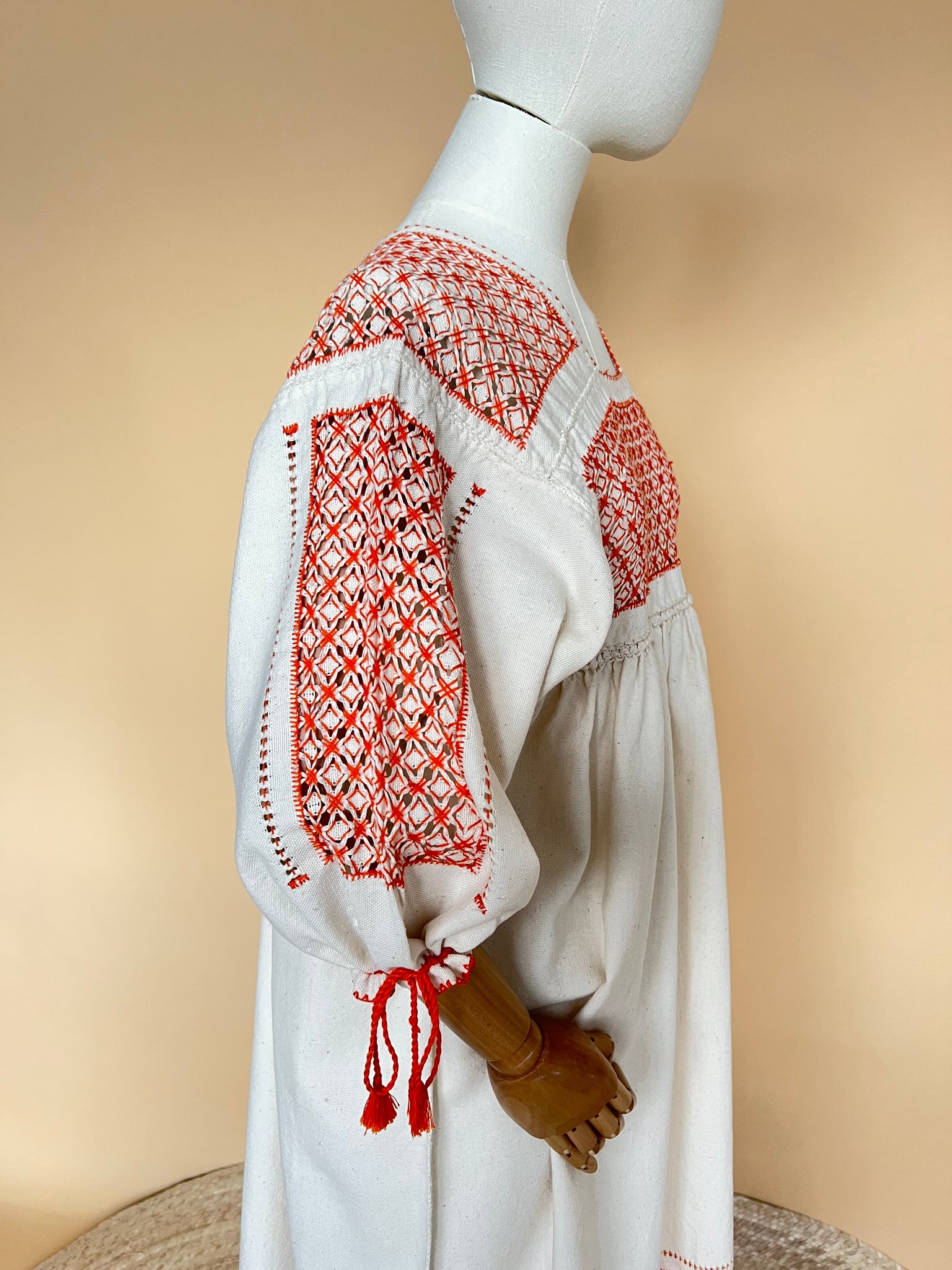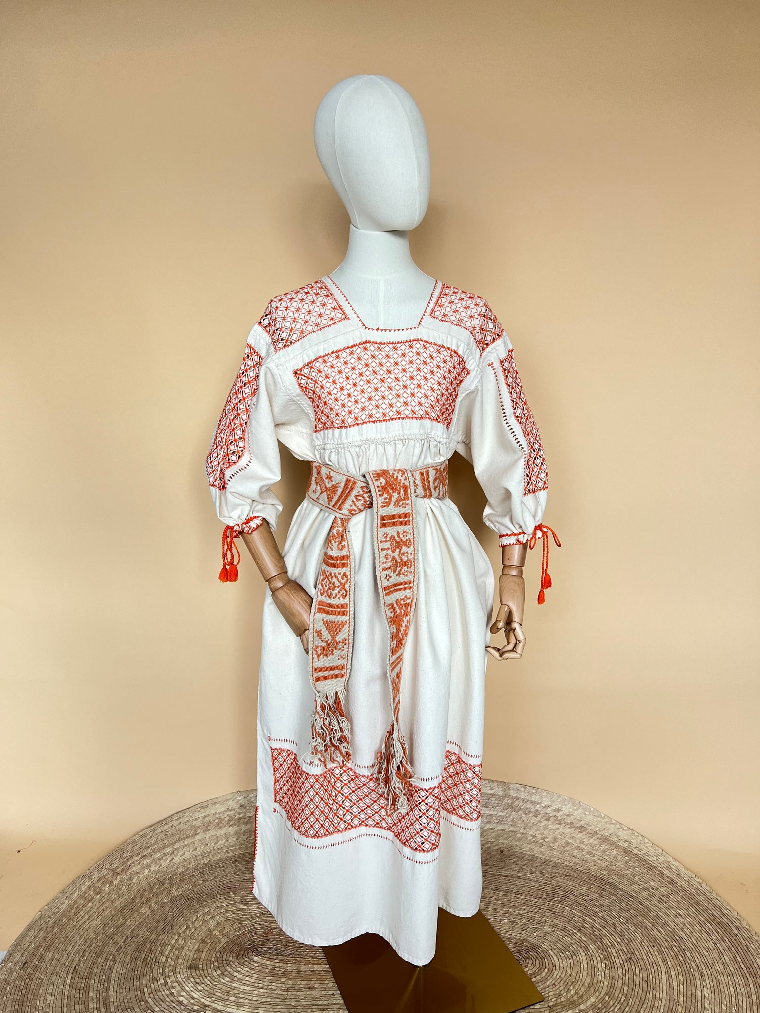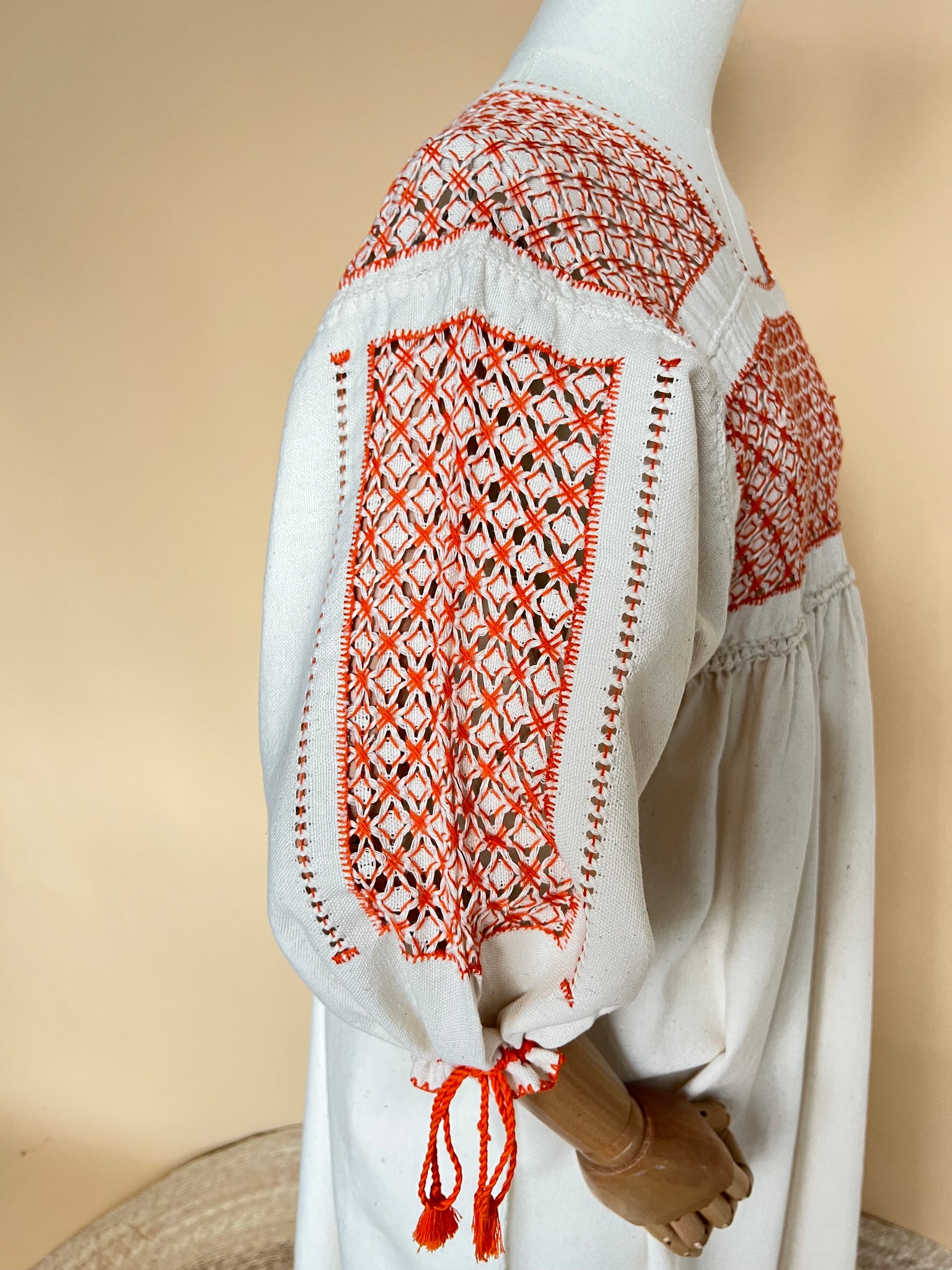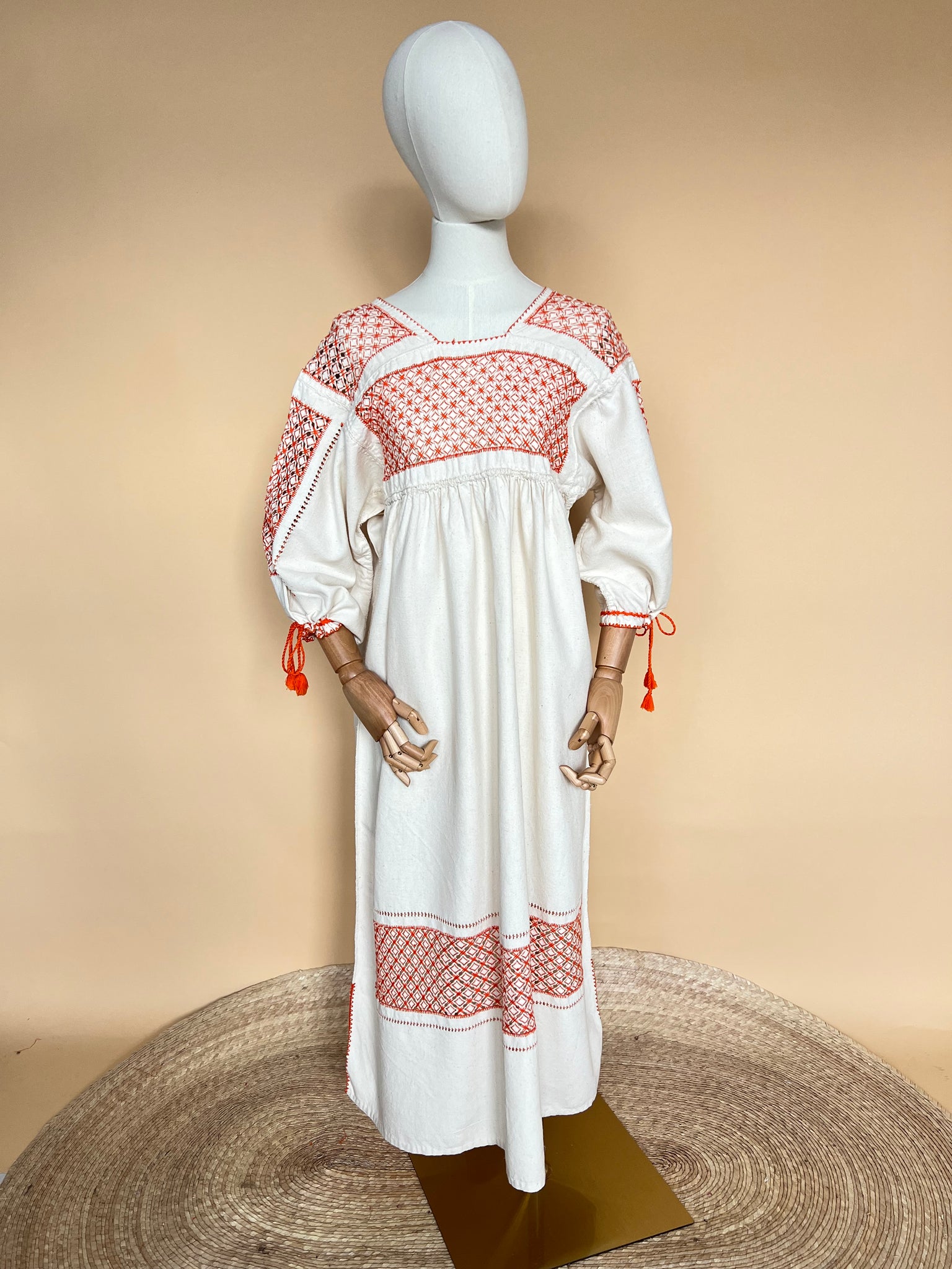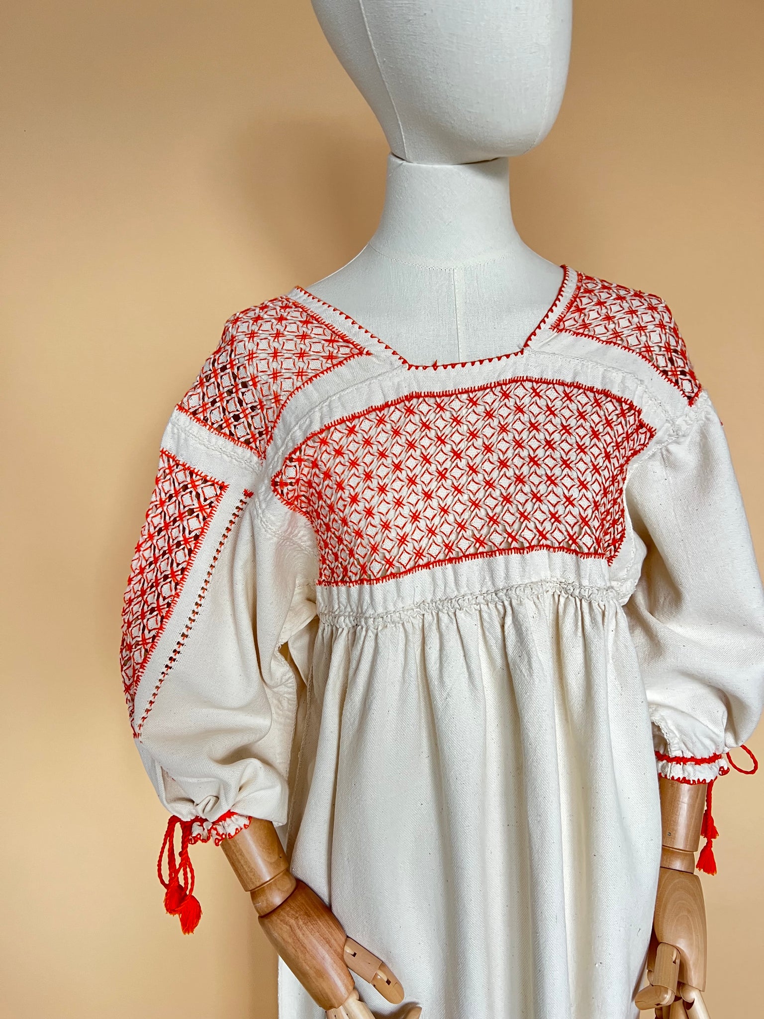 Vestido michoacano en manta artesanal, bordado y confeccionado a mano por artesanas de la región lacustre.