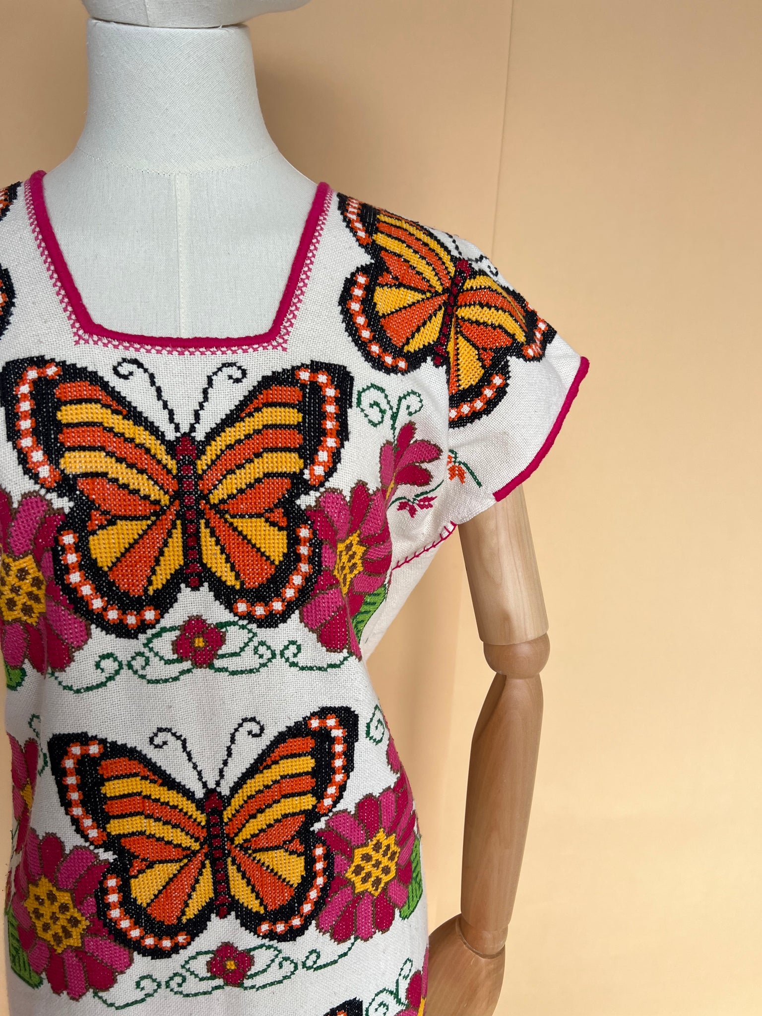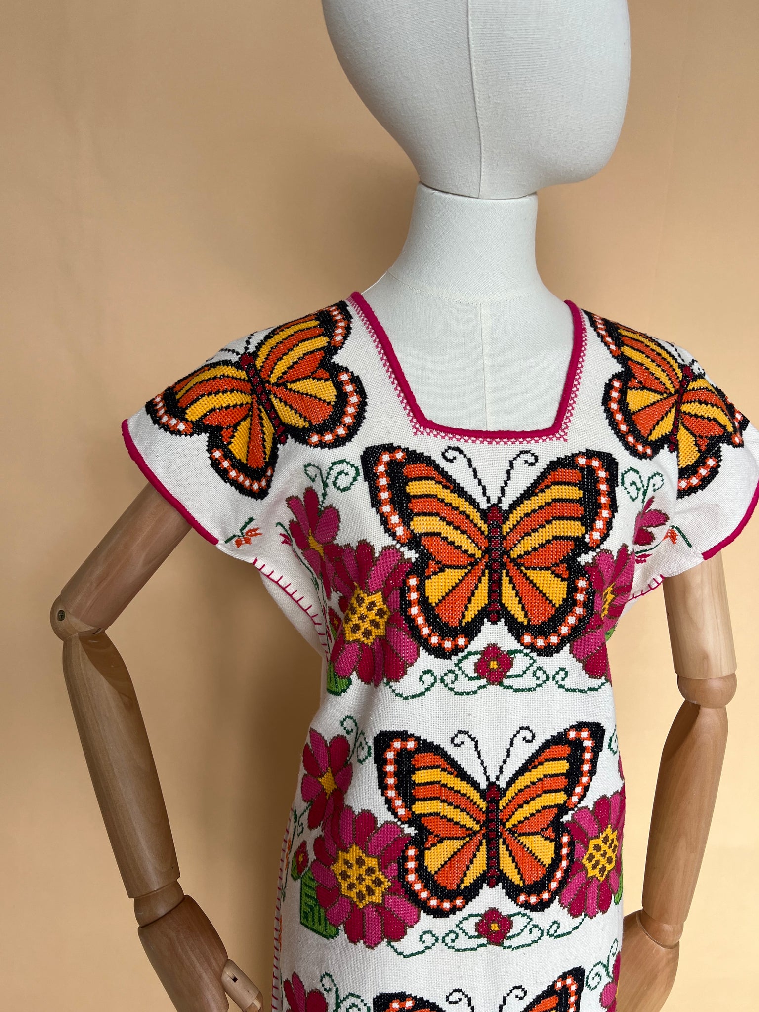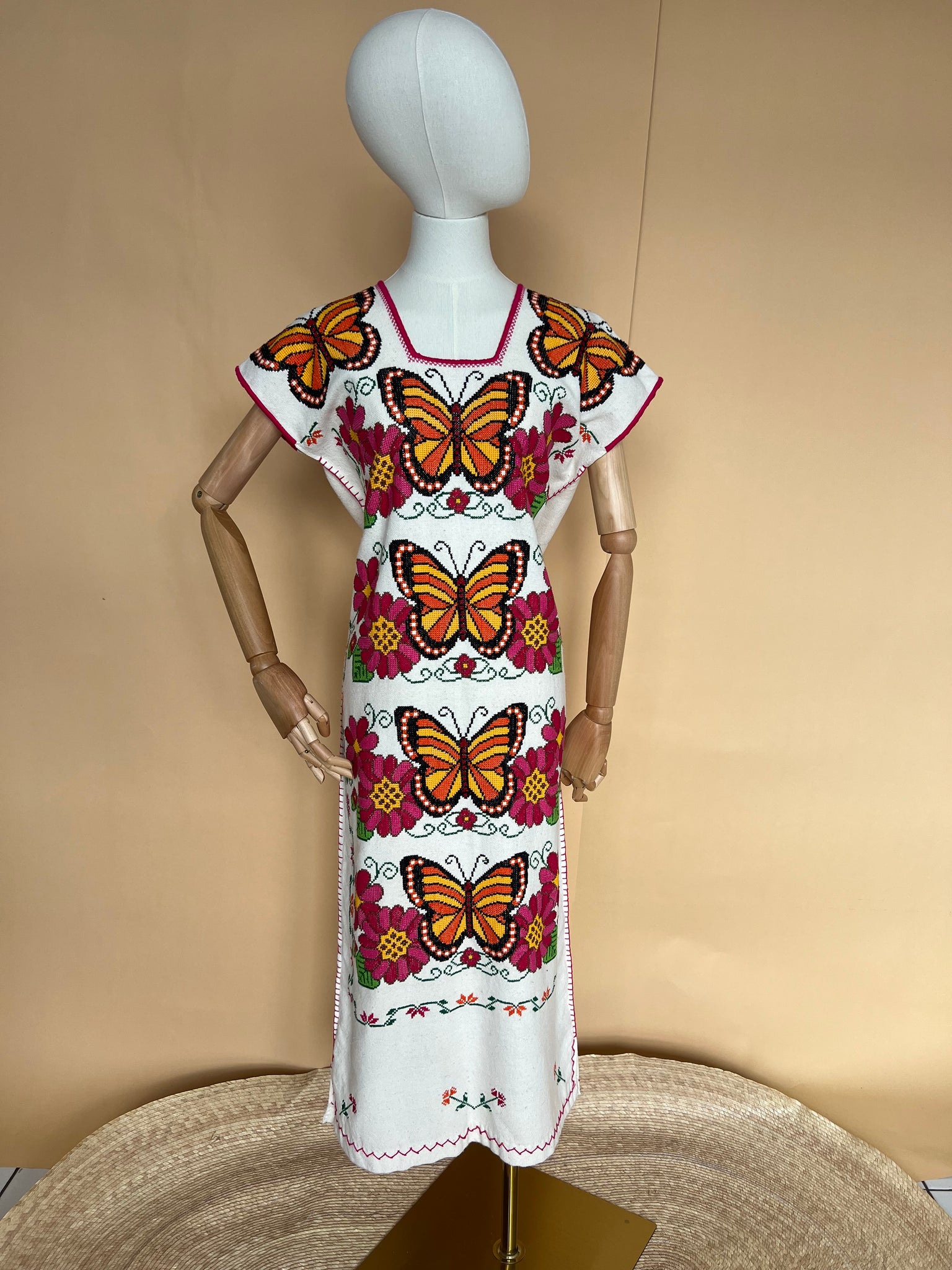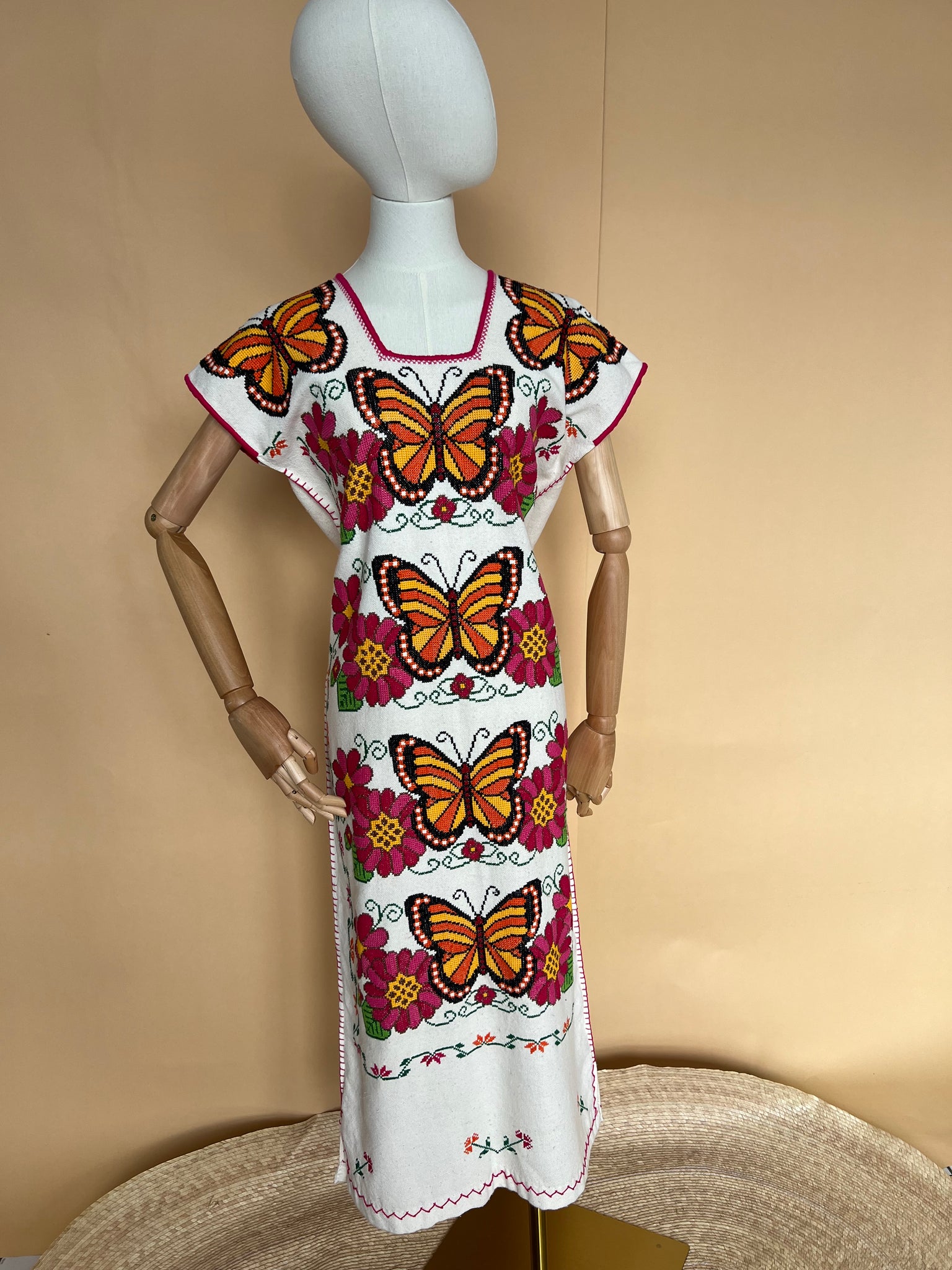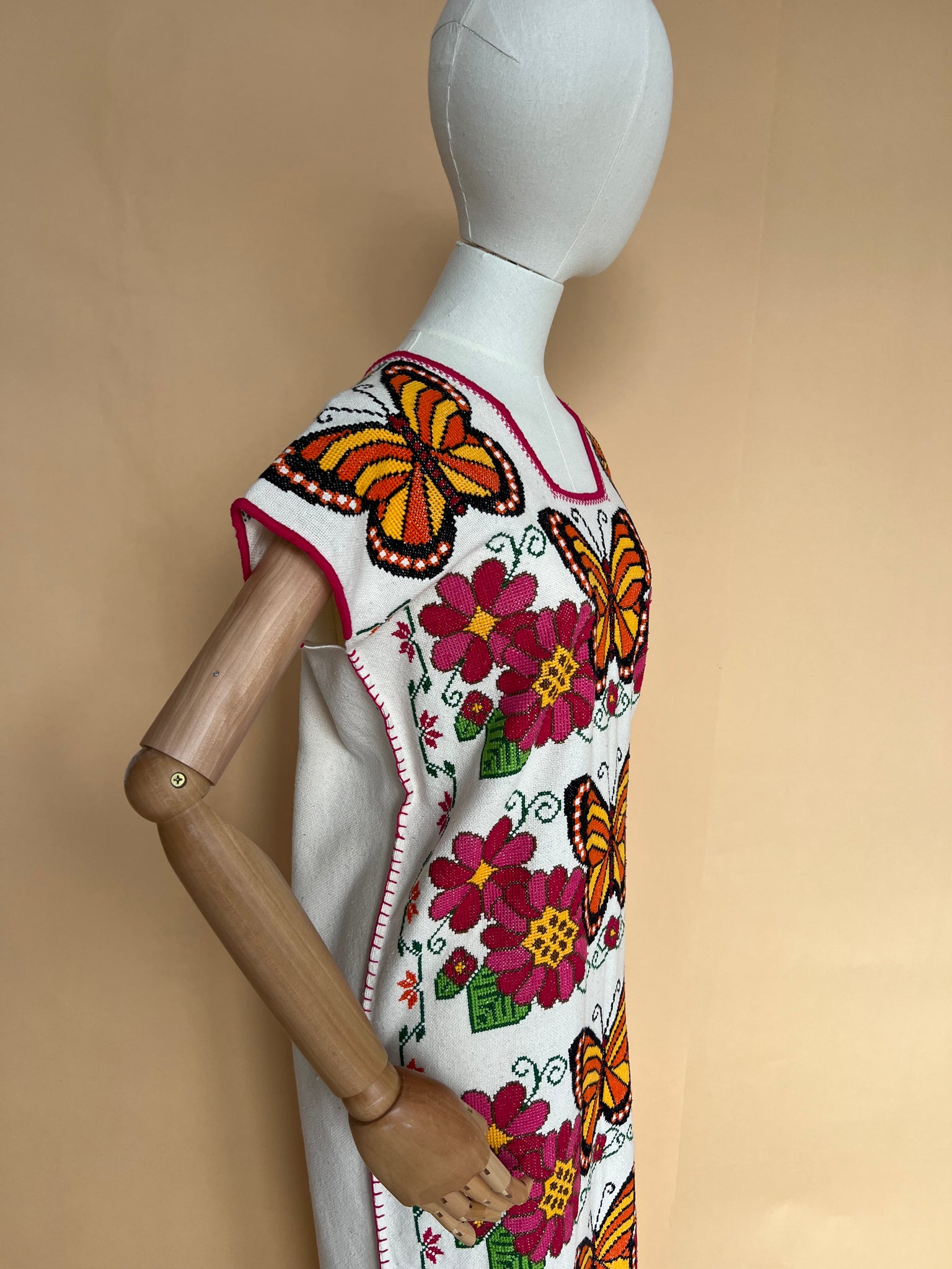 Vestido purépecha en telar de pedal con bordado en punto de cruz por artesanas de la sierra michoacana.
